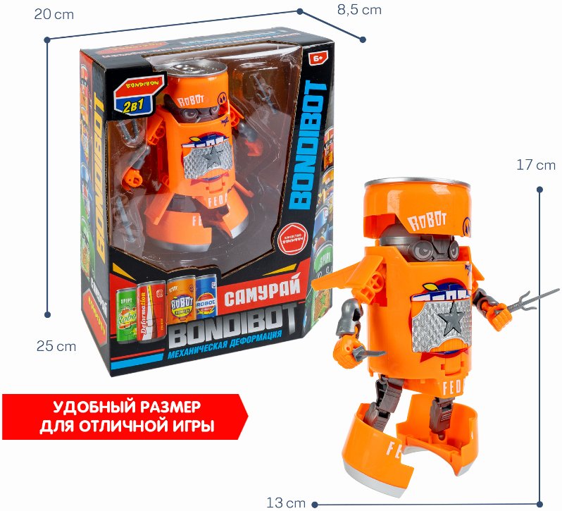 Разыграй друга – предложи ему оранжевую баночку с любимым напитком, в которой ловко замаскировался самурай с оружием! Трансформер BONDIBOT 2 в 1 банка робот от Bondibon – это необычная игрушка, которая дает простор детской фантазии и открывает безграничные возможности для игр! Трансформировать одну игрушку в другую можно сколько угодно раз, благодаря прочным деталям и гибким соединениям. Придумайте с роботом и банкой различные сюжетно-ролевые игры, а также веселые приколы. Трансформер BONDIBOT 2 в 1 банка робот от Бондибон – две игрушки в одной, которые помогут развить интерес к конструированию, воображение и эмоциональный интеллект ребенка. Мальчики будут рады получить такой интересный подарок на день рождения, Новый год, 23 февраля и любой другой праздник. Игрушка изготовлена из качественных безопасных материалов. В набор входят: робот-банка и игрушечное оружие. Возраст 6+ Соберите коллекцию из четырех забавных самураев!