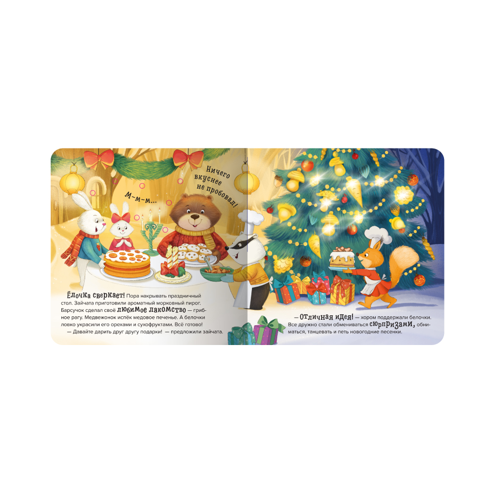 Волшебные огоньки. Ёлочка друзей: «Волшебные огоньки» — новая серия от торговой марки Malamalama! Самая уютная книга на свете — «Ёлочка друзей» — отправляет ребёнка в путешествие по зимнему лесу. Как зверята готовятся к Новому году? С какими чудесами они столкнутся? Милые иллюстрации, добрые персонажи и самые настоящие огоньки на страницах ждут ребёнка в книге. Фонарики на ёлке, свечи в комнате, светлячки или снежинки — внутри каждой страницы располагаются светодиоды, которые выглядывают в крошечные отверстия, заставляя их на самом деле светиться. Отройте для себя настоящее волшебство вместе с Malamalama!
