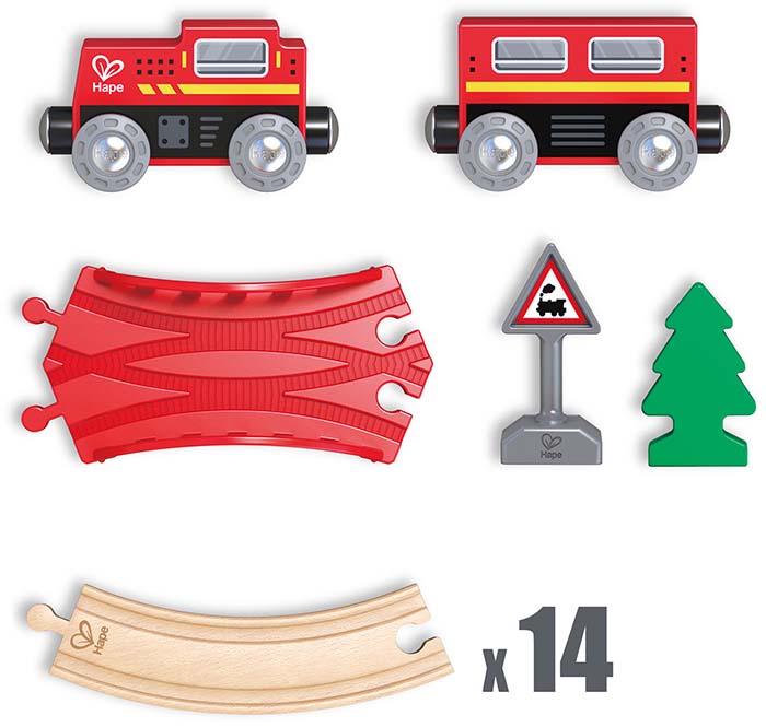 В «Классический набор» входит: 14 деревянных рельсов, паровоз с вагончиком, железнодорожная развилка, дорожный знак и дерево.
