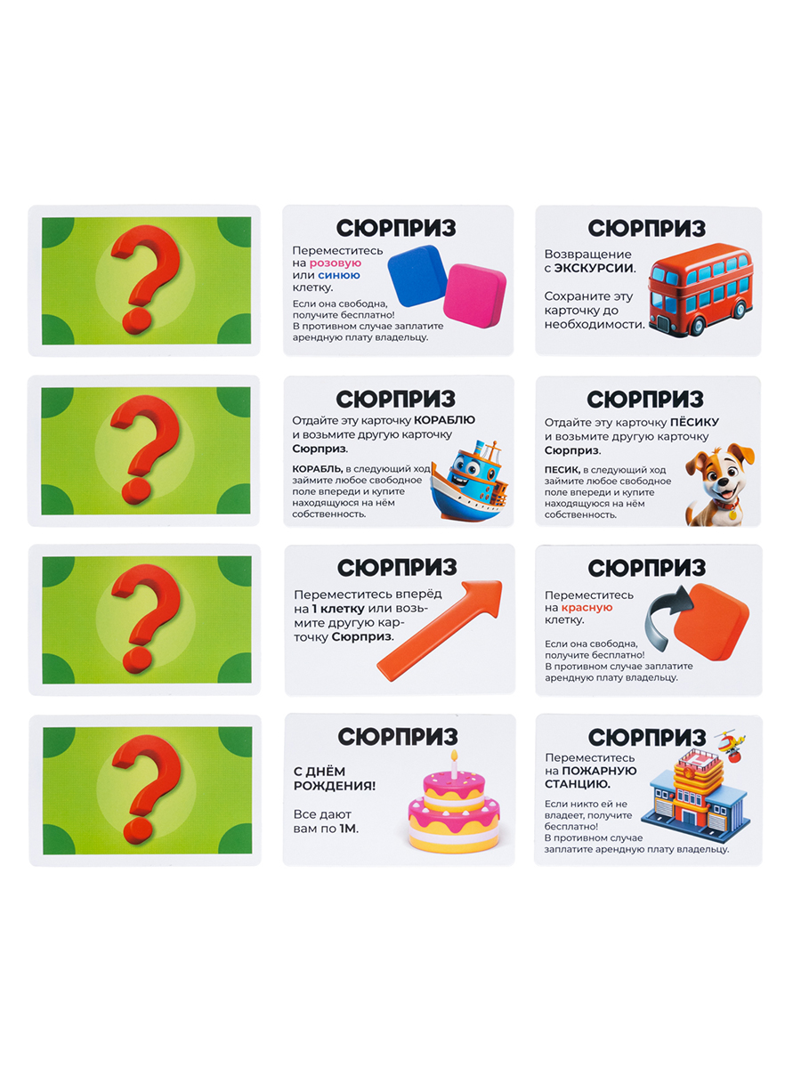 Перемешайте стопку карточек «Сюрприз» и положите их лицевой стороной вниз на соответствующее место на игровом поле.