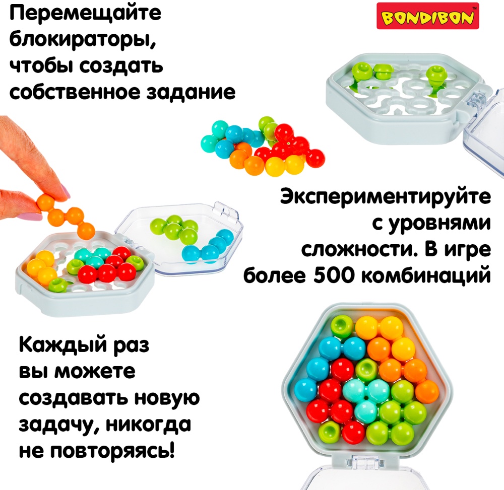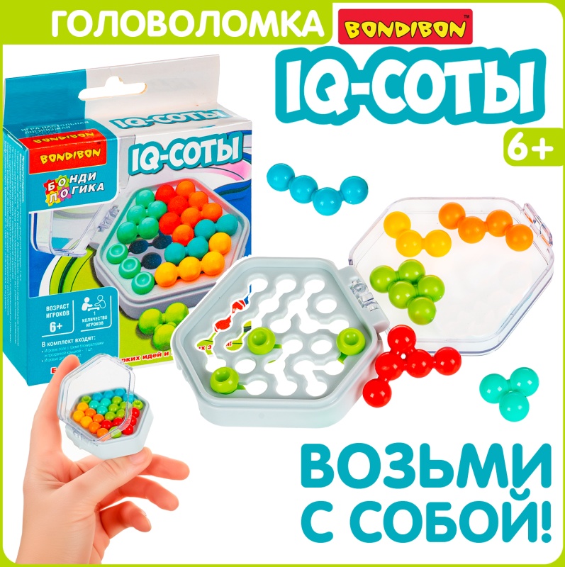 Развивайте мышление с компактной логической игрой IQ-СОТЫ из серии БондиЛогика от Bondibon. Это головоломка нового поколения, в которой нужно верно разместить объемные детали внутри шестигранного игрового поля, обходя блокираторы. Уникальный формат тренирует пространственное мышление, логику и концентрацию. Внутри карманной коробочки вы найдете игровое поле, 6 блоков, выполненных в форме соединенных цветных шариков, и 3 блокиратора. Создайте самостоятельно задание головоломки, разместив блоки-препятствия на поле, и попытайтесь установить все элементы, не оставив пустого пространства. Более 500 вариантов заданий и только одно правильное решение у каждого! Игра рассчитана на 1 игрока и подходит детям от 6 лет. Мини размер делает IQ-СОТЫ отличным выбором для путешествий, ожидания в очереди или игр в дороге. Прочные материалы и продуманная механика гарантируют долгий срок службы и множество увлекательных сессий. Собери коллекцию игр БондиЛогика Бондибон и развивай ум с удовольствием!