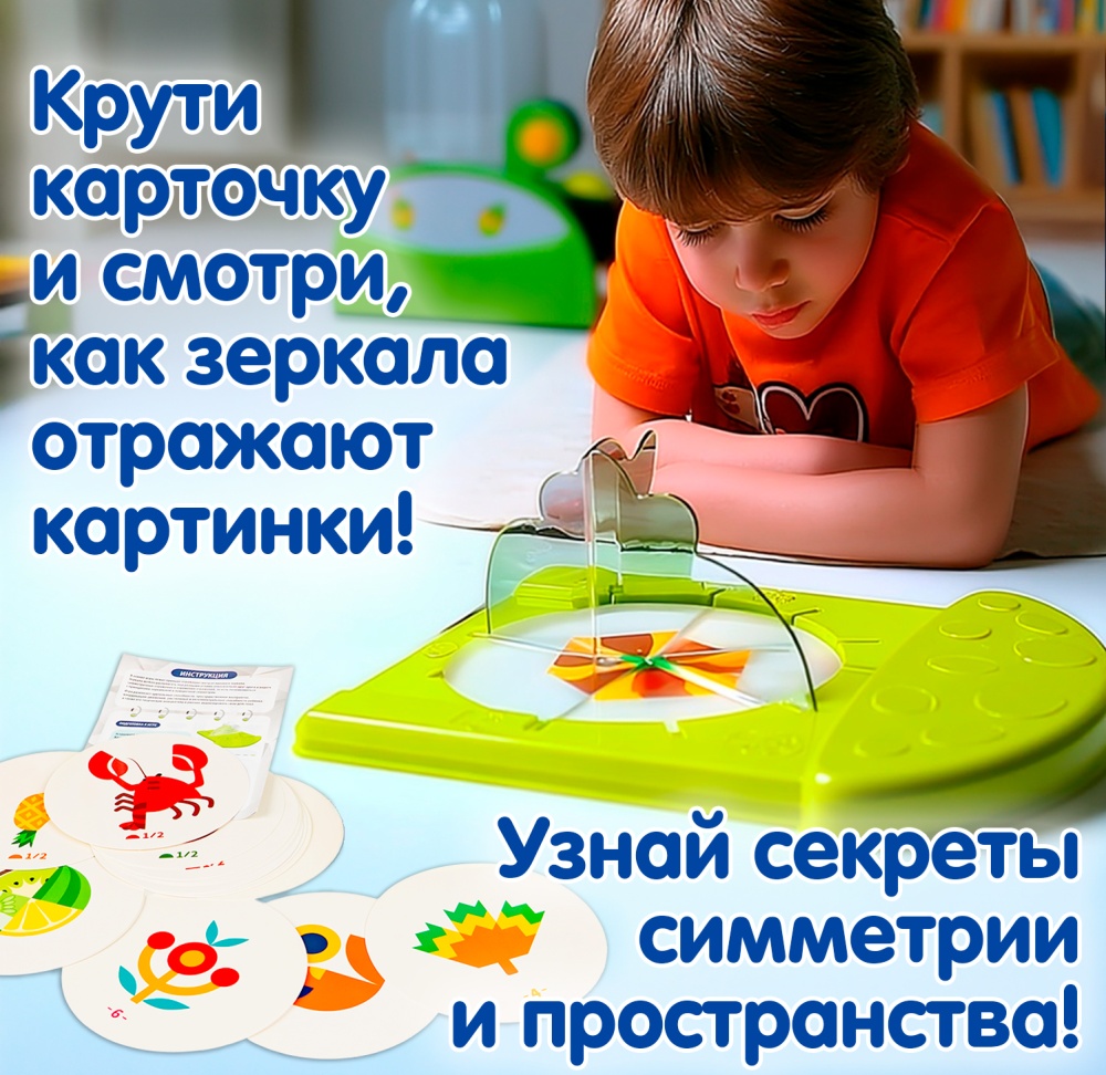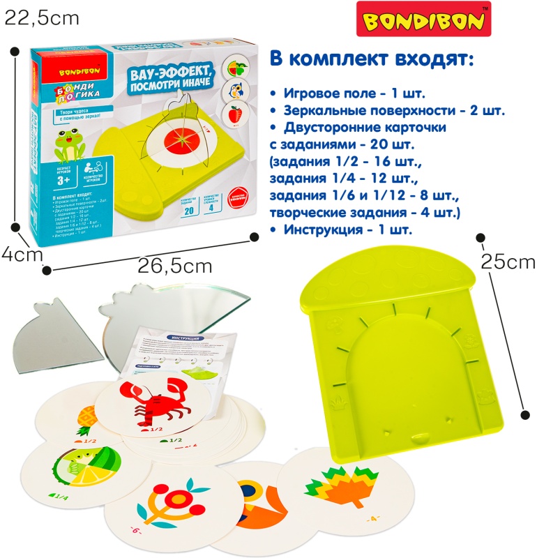 20 двусторонних карточек с заданиями, 2 детали зеркала, игровое поле. Каждый раунд предлагает возрастающую сложность: в наборе карточки с секторами от 1/2 до 1/12. Игра способствует развитию воображения, тренирует концентрацию и логическое мышление, делая обучение весёлым и наглядным. Оцените ВАУ-ЭФФЕКТ и добавьте в коллекцию логических игр Бондибон настоящую оптическую сенсацию!
