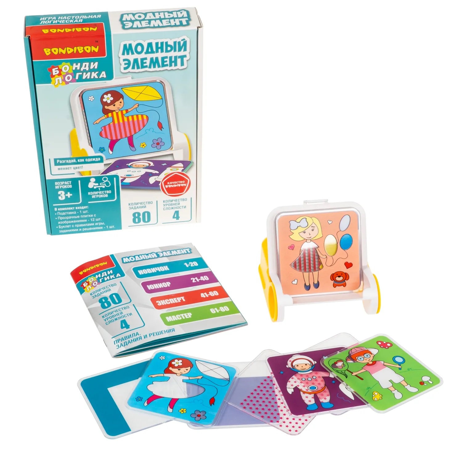 Погрузитесь в мир ярких нарядов и увлекательных модных заданий! Настольная логическая игра МОДНЫЙ ЭЛЕМЕНТ серии БондиЛогика Bondibon подарит детям увлекательное путешествие в мир логики. Задача игрока — разместить полупрозрачные плитки с узорами в правильном порядке, чтобы наряды на итоговых картинках соответствовали условиям задания. Эта необычная механика тренирует внимание, учит планировать действия и развивает умение находить единственное верное решение. Головоломка МОДНЫЙ ЭЛЕМЕНТ помогает формировать логическое мышление, концентрацию и зрительно-моторную координацию. Разгадай загадку модных принтов! Размер игрового поля оптимален для детских рук, а карточки выполнены из прочного материала. В набор входит игровое поле – подставка, 12 плиток с узорамии буклет с правилами и заданиями. В игре 4 уровня с возрастающей сложностью. Для 1 игрока от 3 лет. Познакомьтесь и с другими увлекательными головоломками серии БондиЛогика — каждый набор открывает новые горизонты для игры и развития!