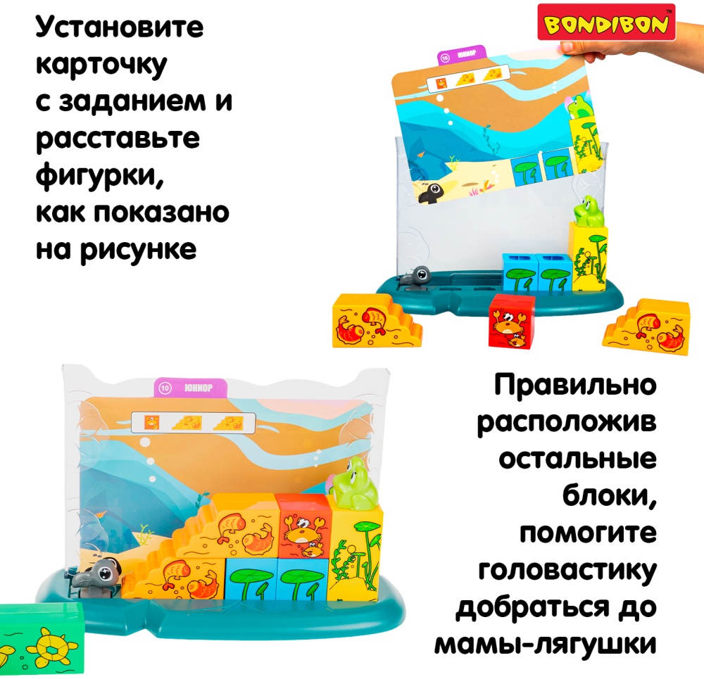 Погрузитесь в мир логики с настольной логической игрой ПОДВОДНОЕ ПРИКЛЮЧЕНИЕ от Bondibon. Это яркая и увлекательная головоломка познакомит ребёнка с понятием маршрута и научит планировать шаги вперёд. Цель игры – помочь маленькому головастику добраться до мамы-лягушки. Игрок выбирает задание с начальным положением деталей, и далее расставляет блоки так, чтобы создать безопасный путь: головастик может подниматься по лестницам, идти по верхним поверхностям, но не прыгать вниз или вверх. Механика тренирует пространственное мышление, логику, концентрацию и зрительно-моторную координацию. В игре 32 задания с нарастающим уровнем сложности.