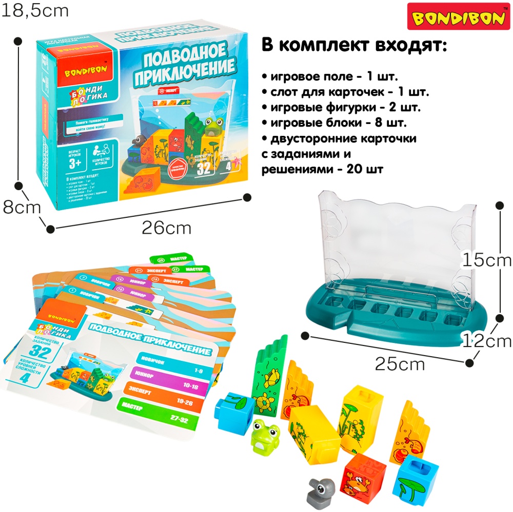 2 фигурки (головастик и лягушка), 5 блоков для построения пути, игровое поле, карточки с заданиями и слот для них. Игра рассчитана на одного игрока от 3 лет. Головоломка ПОДВОДНОЕ ПРИКЛЮЧЕНИЕ – это не только развлечение, но и путь к самостоятельному решению задач. Попробуйте и другие логические игры серии БондиЛогика от бренда Бондибон!