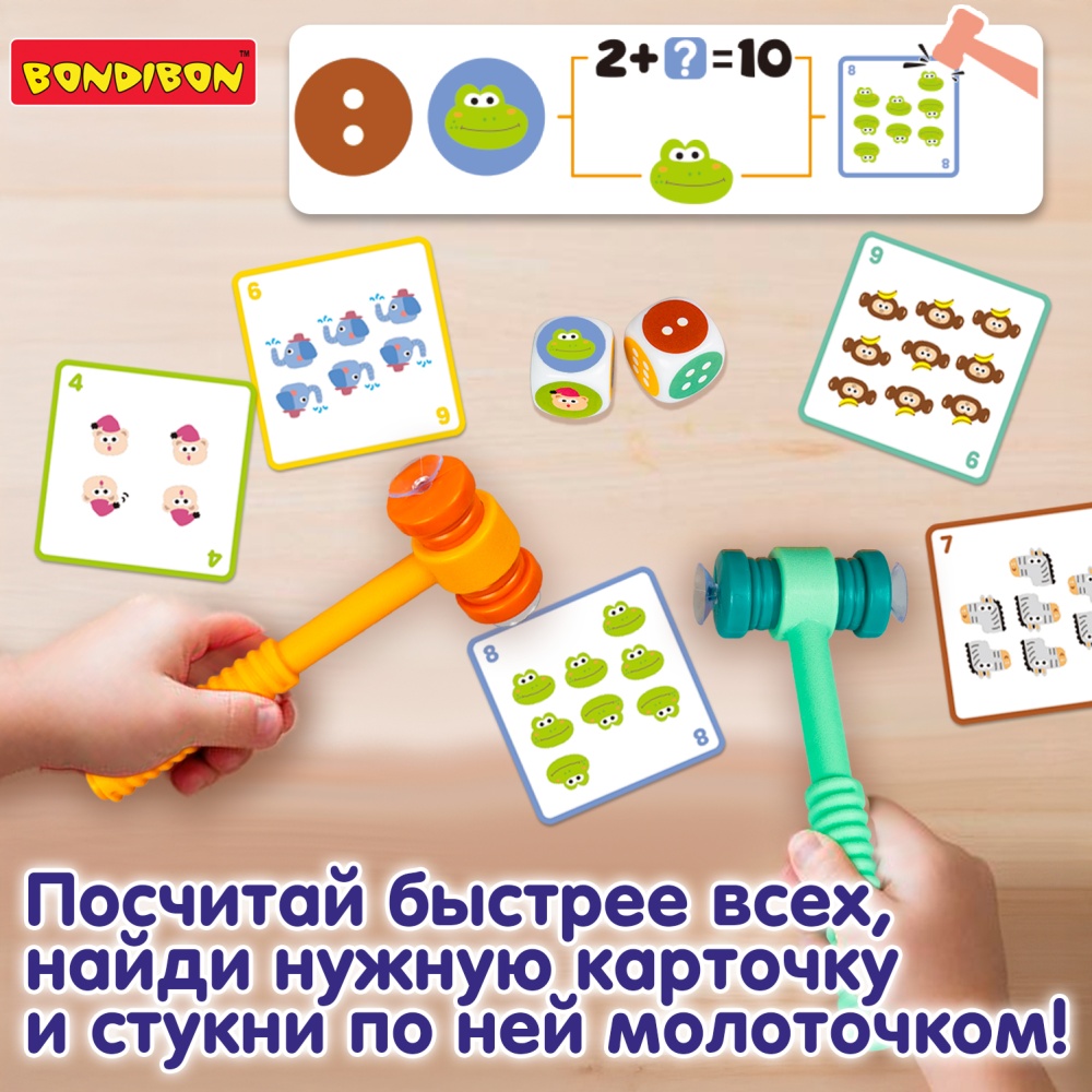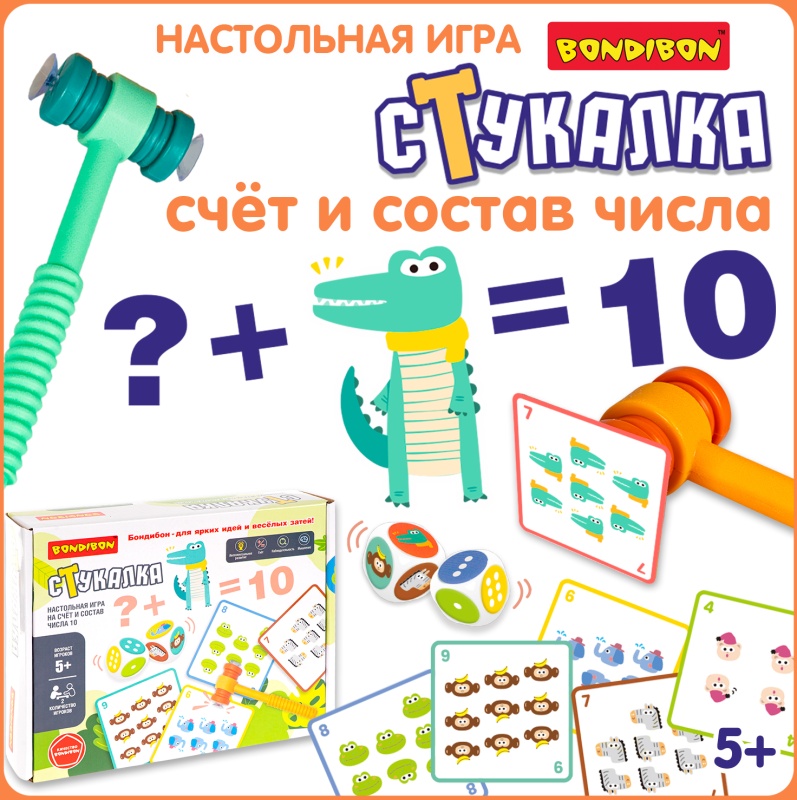 Обучающая настольная игра СТУКАЛКА от Bondibon – это весёлый и активный способ выучить состав числа 10 и потренировать навыки счёта в игровой форме! Идеально подходит для детей от 5 лет, которые только начинают осваивать математику. Разложите карточки, кидайте кубики с животным и цифрой и быстрее остальных и найдите карточку, на которой изображено то количество нужных животных, которое даст в сумме 10 вместе с выпавшим числом. Главное веселье – это молоточки с присосками, которыми игроки стучат по карточке-ответу, забирая ее себе! Побеждает тот, соберет больше всех карточек! Комплектация игры: 36 карточек, 2 молоточка с присосками, 2 кубика, наклейки. Игра СТУКАЛКА на счет и состав числа от Бондибон развивает быстроту реакции, концентрацию и внимание. Дети играют с азартом, незаметно закрепляя математические знания. Формат игры позволяет использовать её как дома, так и в детском саду или на занятиях по подготовке к школе. Игра дарит полезное обучение, весёлое движение и яркие эмоции!