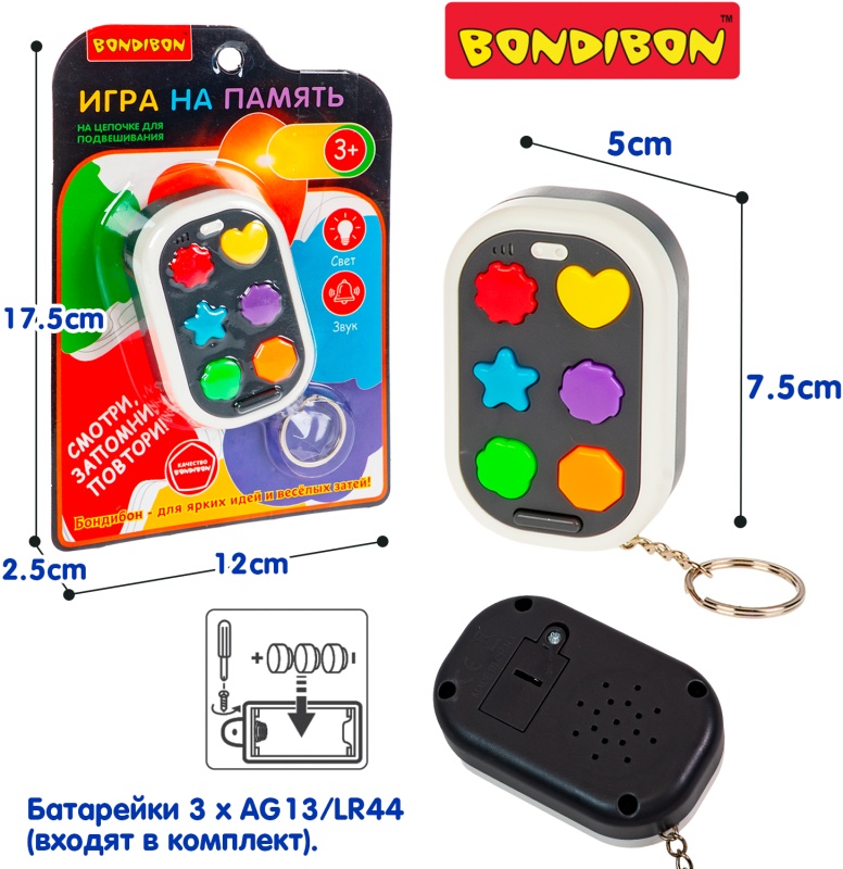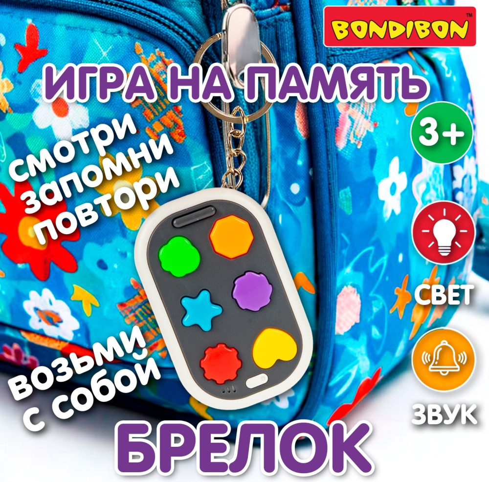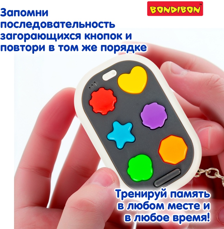 Развивающая игра НА ПАМЯТЬ от Bondibon — компактный электронный брелок-головоломка серого цвета, созданный для тренировки памяти, внимания и быстрой реакции в любом месте и в любое время! Благодаря удобной цепочке игрушку можно легко повесить на рюкзак, сумку или ключи и брать с собой в дорогу. Игроку необходимо запомнить последовательность подсветки кнопок и воспроизвести её, нажимая на цветные кнопки в том же порядке. При правильном повторении раздаётся победный сигнал, и игрок переходит на следующий уровень, где последовательность становится длиннее и сложнее. При ошибке игра издаёт звук поражения и начинается заново. Яркая подсветка, кнопки необычной формы и прикольный звук делают игру азартной и увлекательной, побуждая игроков добиваться прогресса. Работает от 3 батареек AG13/LR44 (в комплекте) Рекомендовано детям от 3 лет. Игра НА ПАМЯТЬ от Bondibon — отличный подарок, который будет интересен и детям, и взрослым!