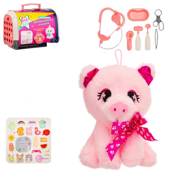 В комплекте очаровательная мягкая игрушка-зверюшка (котик, щенок, единорожка, зайка, поросенок), которая станет первым пациентом.