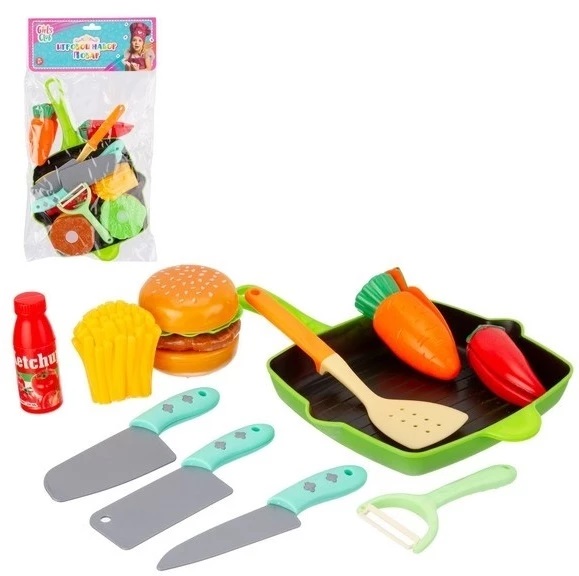 Состав: сковорода, лопатка, 3 ножа, нож для чистки овощей, бургер, картошка фри, кетчуп, морковь, перец чили.