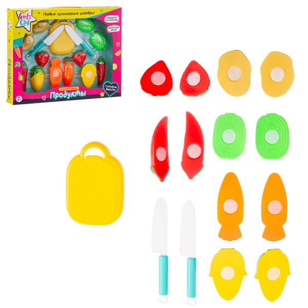В комплекте разделочная доска и 2 безопасных пластиковых ножа. Игрушечные фрукты и овощи: картофель, китайская капуста, морковь, клубника, кукуруза, острый перец.