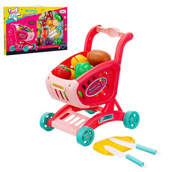 В комплекте удобная вместительная тележка для продуктов, овощи, фрукты, разделочная доска и 2 безопасных пластиковых ножика.