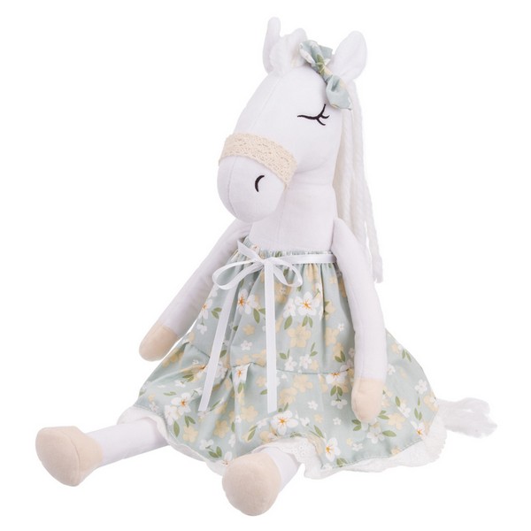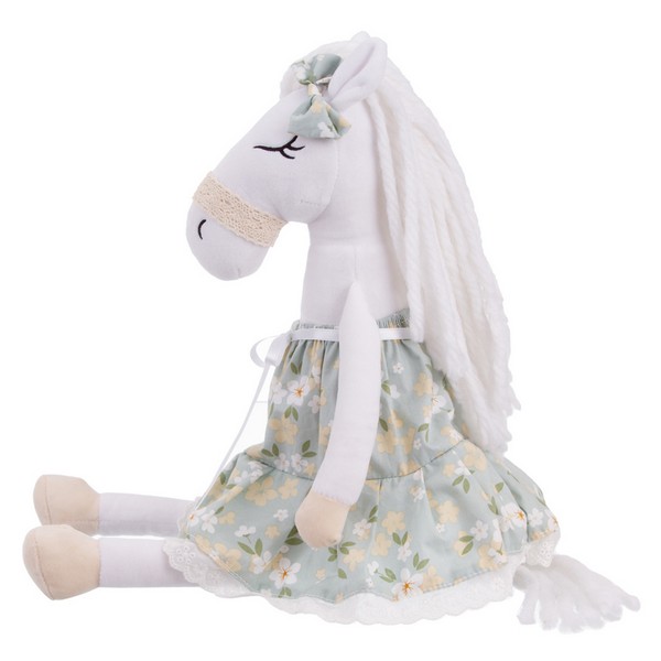 Белая Лошадка с белоснежной гривой в платье с кружевами и лентами Поллет – это утонченная красивая мягкая игрушка, которую можно преподнести как украшение праздничного новогоднего интерьера или как прекрасный подарок вашим близким, тем кто ценит эстетику и любит продуманные наряды. Лошадка одета в красивое платье с отделкой кружевами и лентами. На голове у нее бант в тон платья. Она создана из мягчайшего плюша и с элементами вышивки в одном размере.