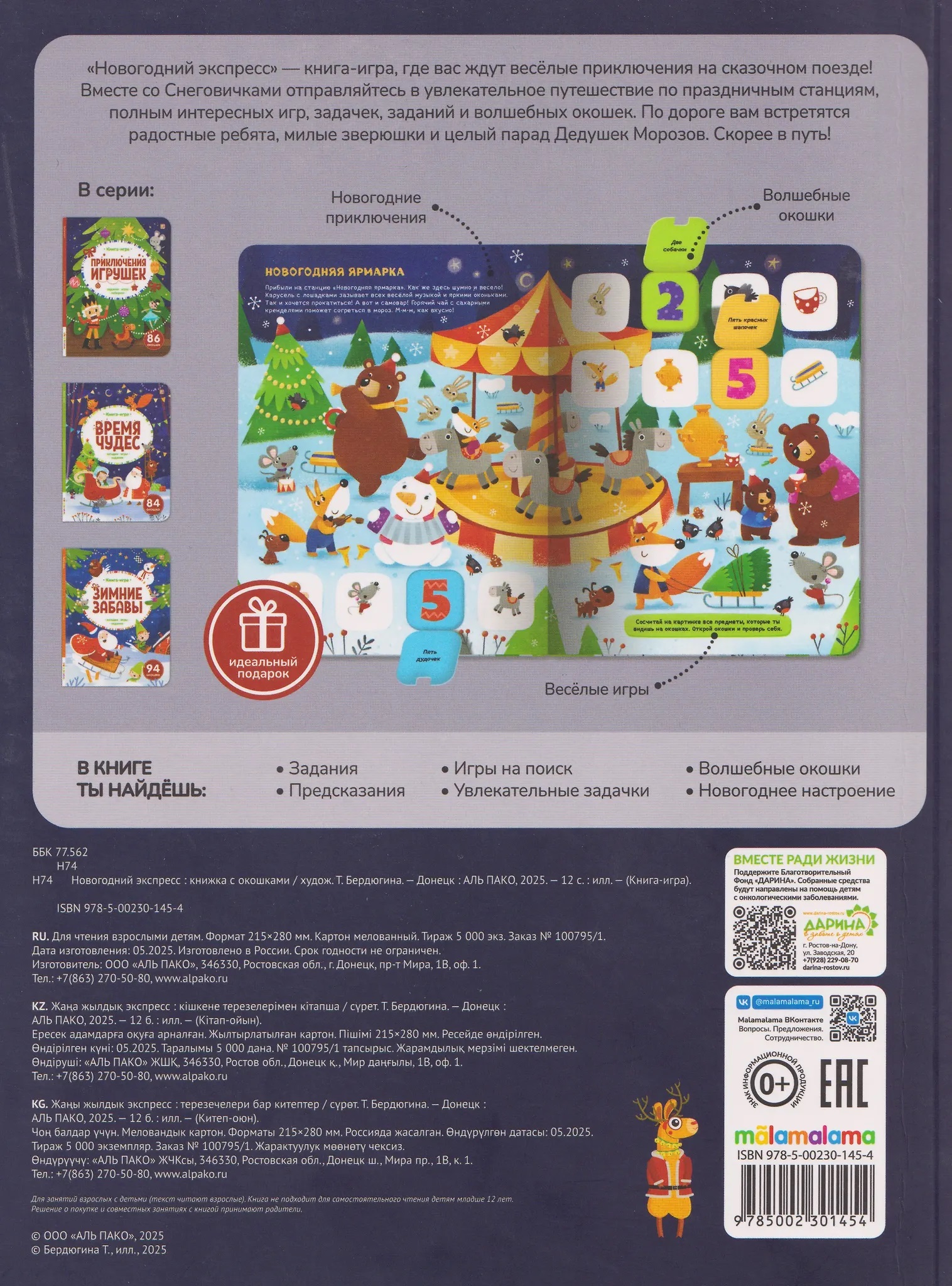 Книга-игра «Новогодний экспресс» — это большая книга, полная занимательных загадок и задачек для всей семьи. Собирайтесь за предпраздничным столом, открывайте окошки — наслаждайтесь уютной атмосферой приближающегося Нового года, весёлых игр и заданий, красочных иллюстраций и любимых персонажей! Проводите время весело и с пользой — встречайте Новый год вместе с книгами от торговой марки Malamalama!