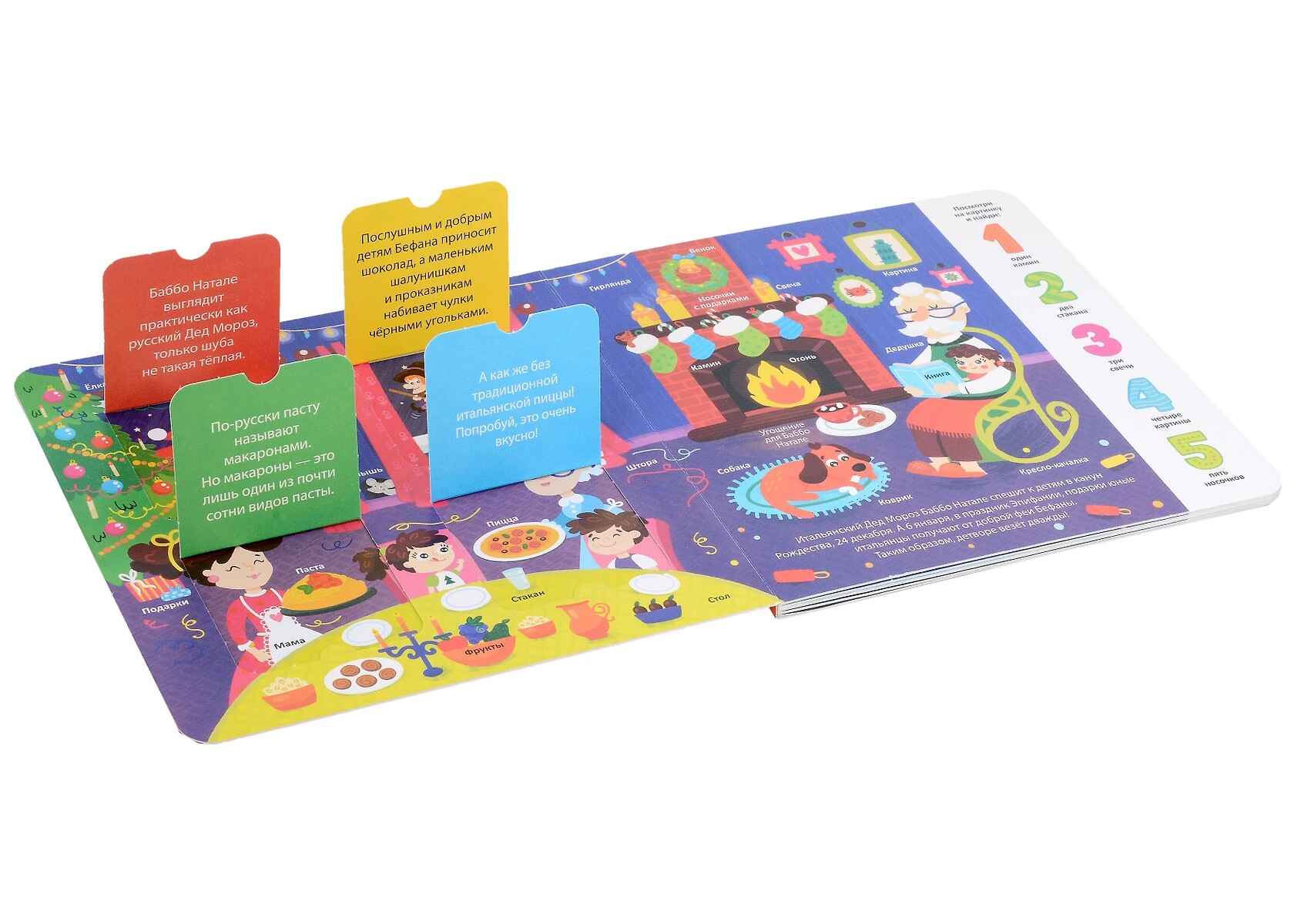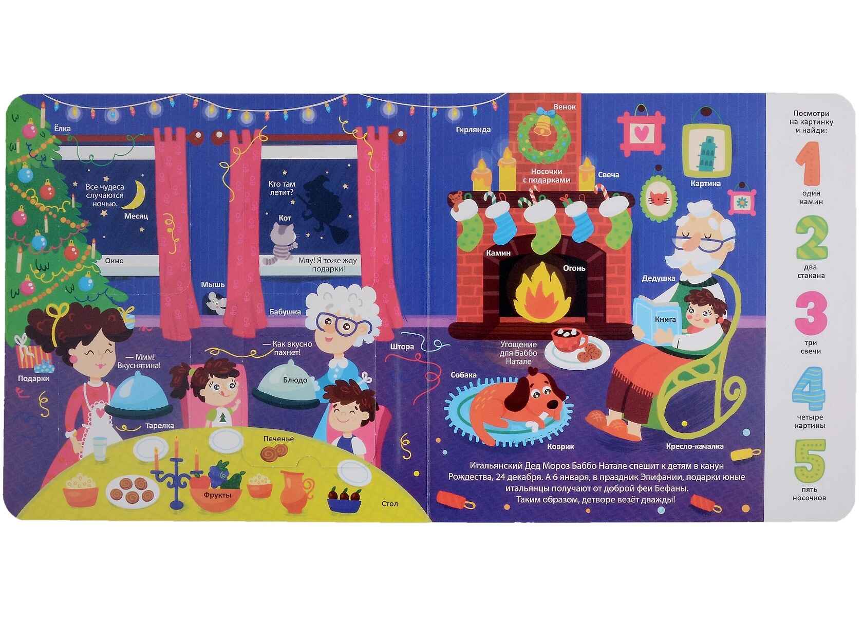 Книга «Новый год разных стран» из серии «Мои первые слова» – это любимый зимний праздник в разных уголках Земли. Санта Клаус и фея Бефана, финские гномы и японские драконы, Дедушка Мороз и Снегурочка – традиции разных стран под одной обложкой. Яркие картинки надолго задержат внимание малыша, а слова в окошках помогут расширить словарный запас и развить память. На каждом развороте приготовлено интересное задание на смекалку и внимательность. Играйте, читайте, учите новые слова, погружайтесь в новогоднюю атмосферу и заряжайтесь отличным настроением!