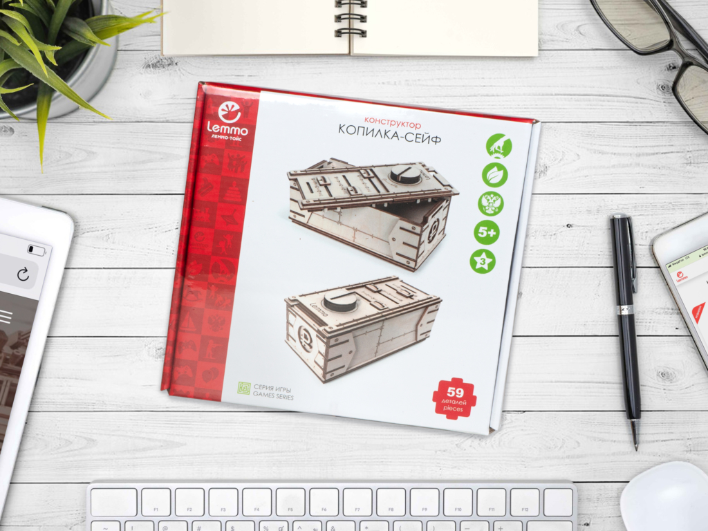 У собранной модели поворачивается ручка, двигаются указатели кодового замка и открывается крышка. Копилка предназначена для бумажных купюр и монет.