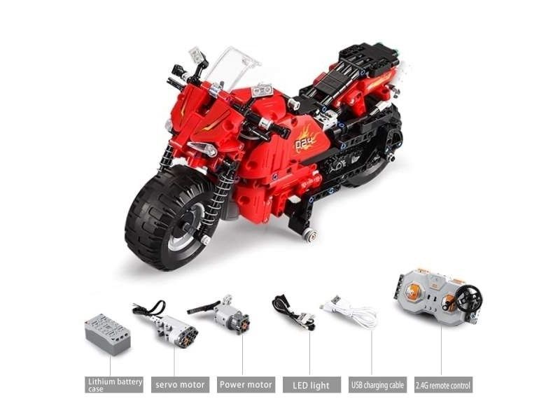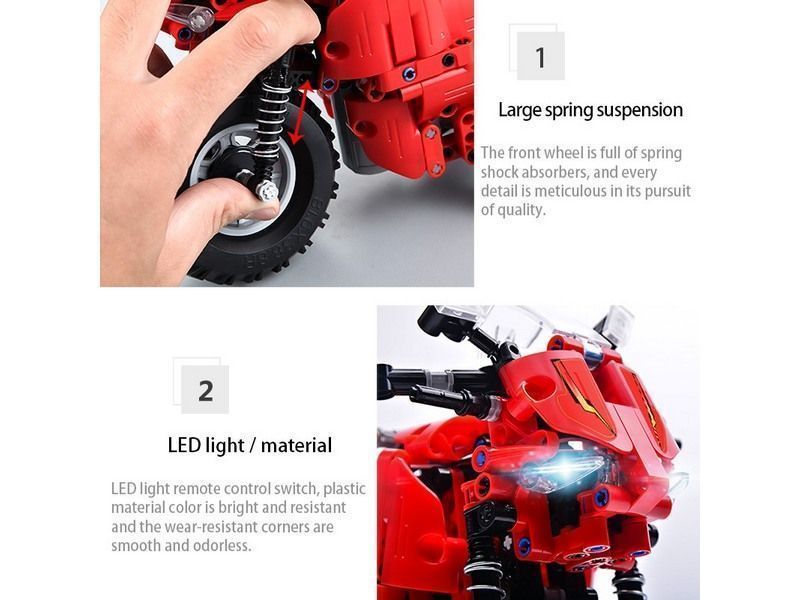 Ребенка захватит процесс сборки мотоцикла с самого начала. А когда получится гоночный мотоцикл, собранный из 484 деталей, не менее захватывающимися будут и игры. Мотоцикл управляется пультом дистанционного управления 2.4Ghz, что делает игру более интересной. Управляемый пультом, мотоцикл движется вперед, назад, влево и право.