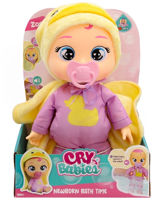Кукла Зои Время купания плачущая интерактивная Cry Babies высотой 29 см с пустышкой, прикрепленной к пижамке, и полотенчиком. Для того чтобы слезы вытекали из глаз при нажатии на голову, необходимо залить воду в специальный отсек на голове куклы и вынуть пустышку.