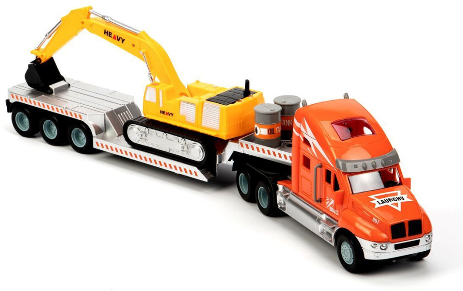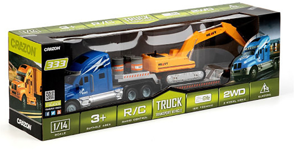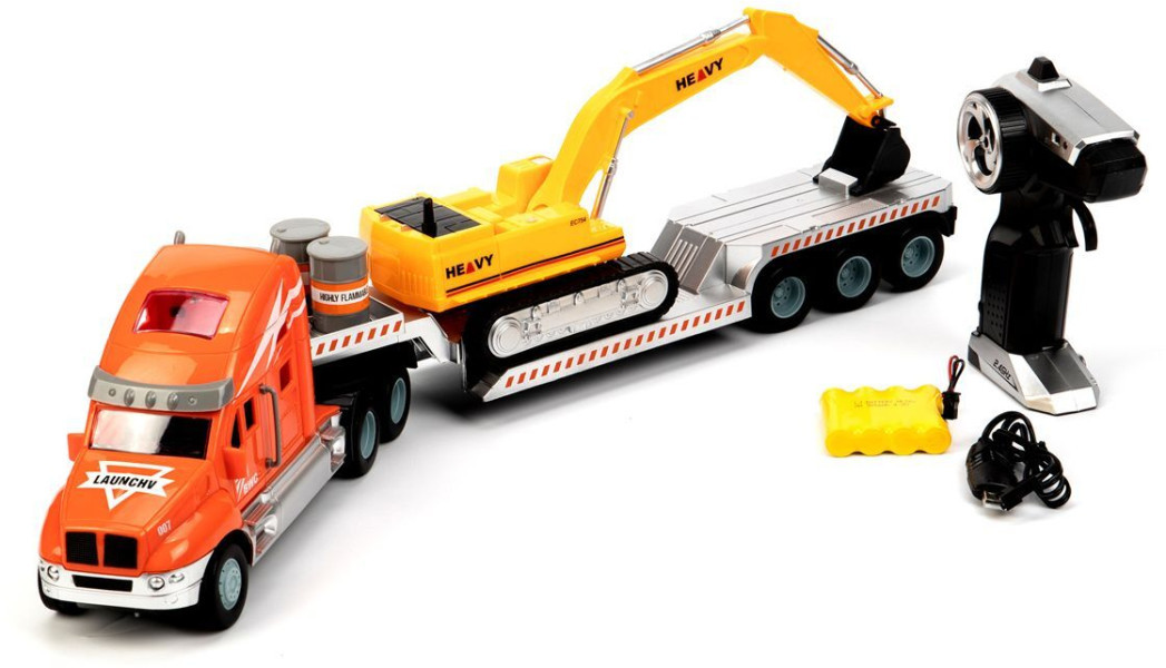 Комплектация: машинка-трал, прицеп с экскаватором, аккумулятор, пульт управления, USB кабель