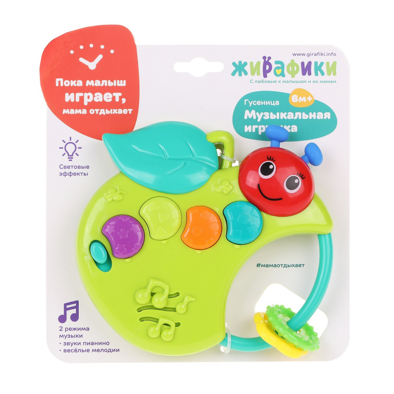 В полугодовалом возрасте малыш испытывает большой интерес к игрушкам, издающим различные звуки. С забавной музыкальной игрушкой «Гусеница» будет очень интересно! Гусеничка работает в двух режимах: она проигрывает весёлую музыку и звуки пианино. В последнем режиме малыш сможет сыграть по ноткам настоящую мелодию! Режимы можно менять с помощью переключателя. На ручке расположены фигурные колечки для развития мелкой моторики. Малыш будет завороженно двигать их пальчиками, пока играет музыка и светятся цветные кнопочки. Это так увлекательно!
