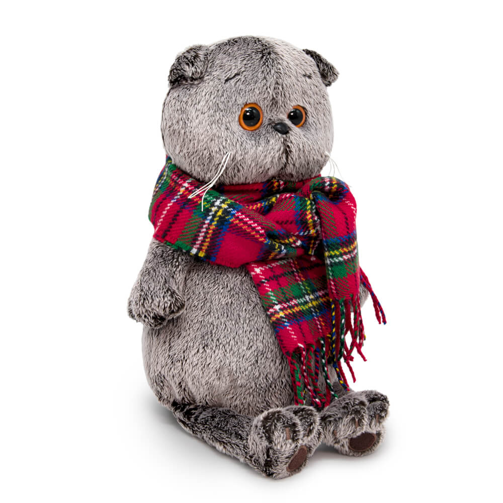 Кот в объёмном шерстяном шарфе в красно-зелёную клетку.