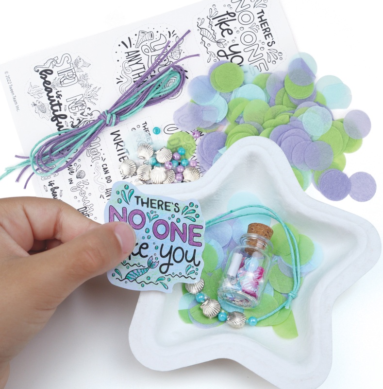 В бумажную звёздочку помещается мини-бутылочка с вдохновляющей фразой и конфетти, затем запечатывается и декорируется с помощью красок, блёсток, чернил и наклеек.