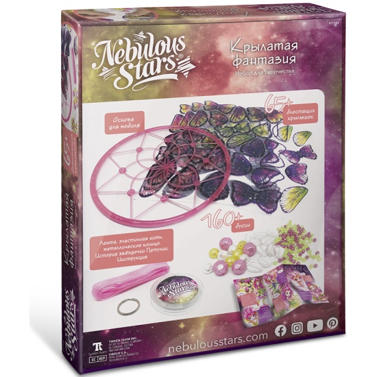 Набор для творчества. Создание украшения для комнаты с помощью пластиковых заготовок в форме крылышек бабочки, бусин, ленты-паутинки и специального круглого держателя, светящегося в темноте. В набор входит подробная инструкция и буклет с историей звездочки Petulia. Набор предназначен для детей старше 7 лет. Комплектация: подвижный держатель, более 65 блестящих крылышек, более 160 бусин, лента, эластичная нить и металлическое кольцо, полная история звездочки Petulia, инструкция Размер индивидуальной упаковки: 22,2 х 27,9 х 4,5 см