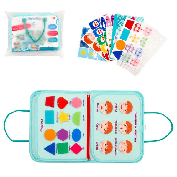 Книжку удобно брать с собой: она застегивается на пуговицу, а также у нее есть ручки транспортировки, что делает книжку похожей на папку-сумку с учебными материалами.