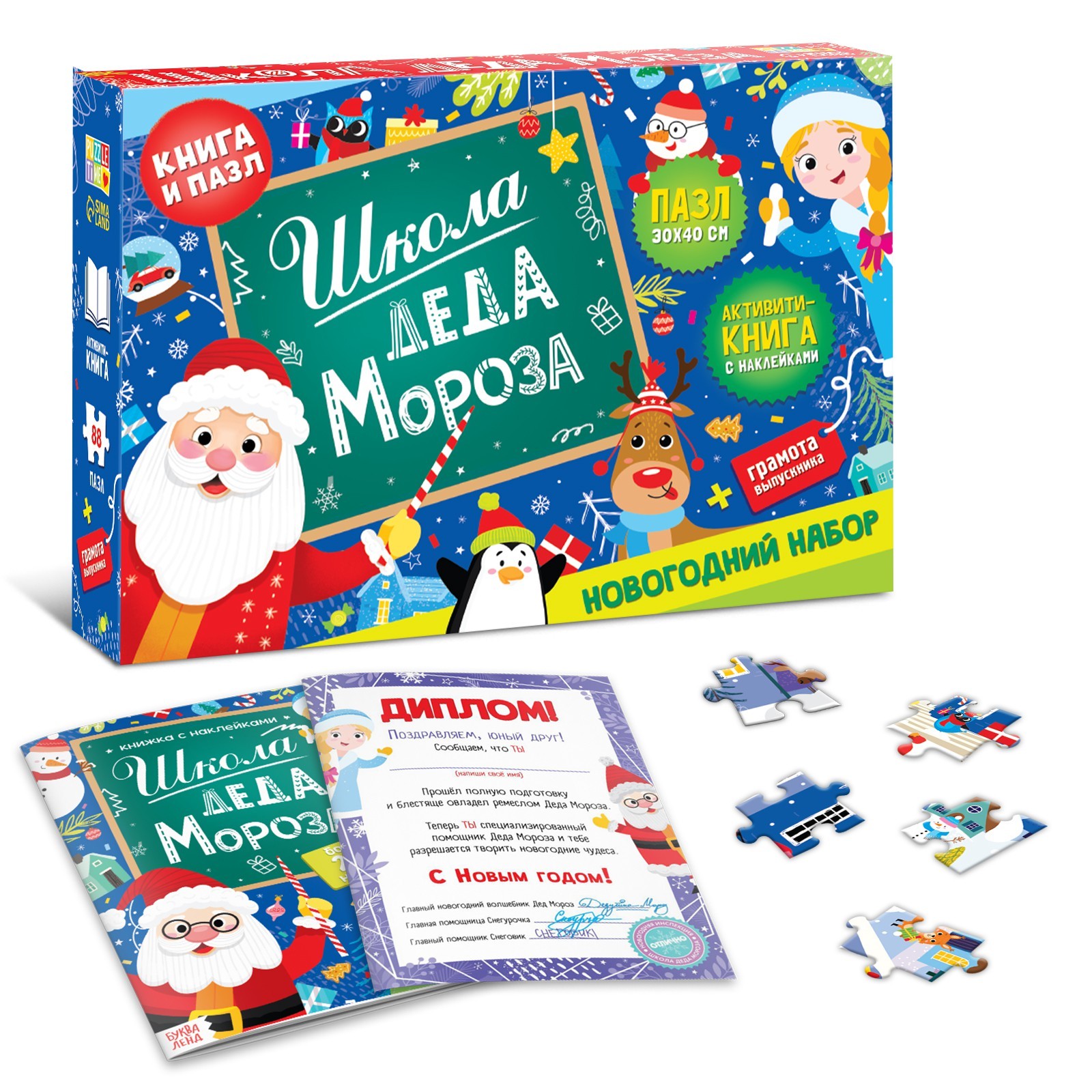 Внутри вы найдёте книгу с наклейками, пазл и диплом выпускника Школы Деда Мороза.