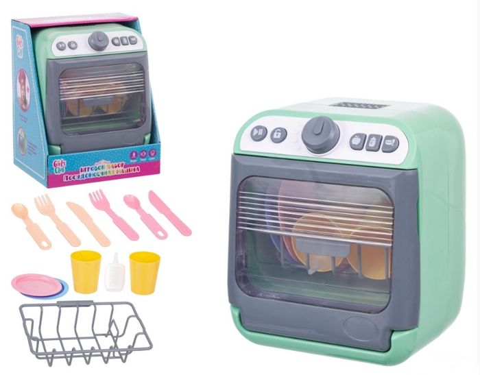 Посудомойка на игрушечной кухне – незаменимый бытовой предмет. В наборе есть все, чтобы процесс мытья посуды был полноценным и технологичным. На посудомойке можно выбрать режим работы, загрузить в контейнер сетку тарелки, стаканы и столовые приборы. Чтобы работа прибора была максимально реалистичной, в резервуар в дверце нужно залить около 40 мл воды( резервуар для набора воды в комплекте) Когда дверца закроется и будет нажат кнопка включения, вода начнет разбрызгиваться по пространству посудомойки имитируя мытье посуды.