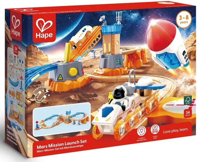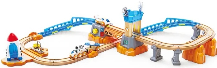 Комплектация: 12 деревянных рельсов, 3 транспортных вагона, стартовая платформа космического поезда, ракета, стартовая платформа для ракеты, 2 больших поднимающихся пластиковых рельса, 2 коротких пластиковых рельса, 4 моста, 2 марсианских горы, радар, антенна, лист с наклейками; всего 31 элемент.