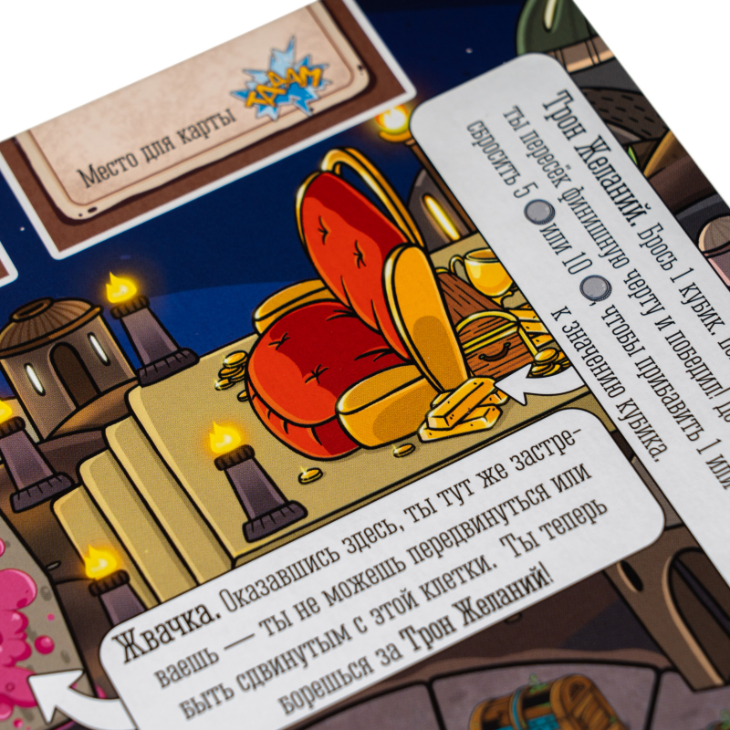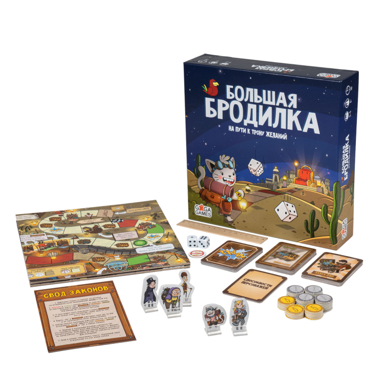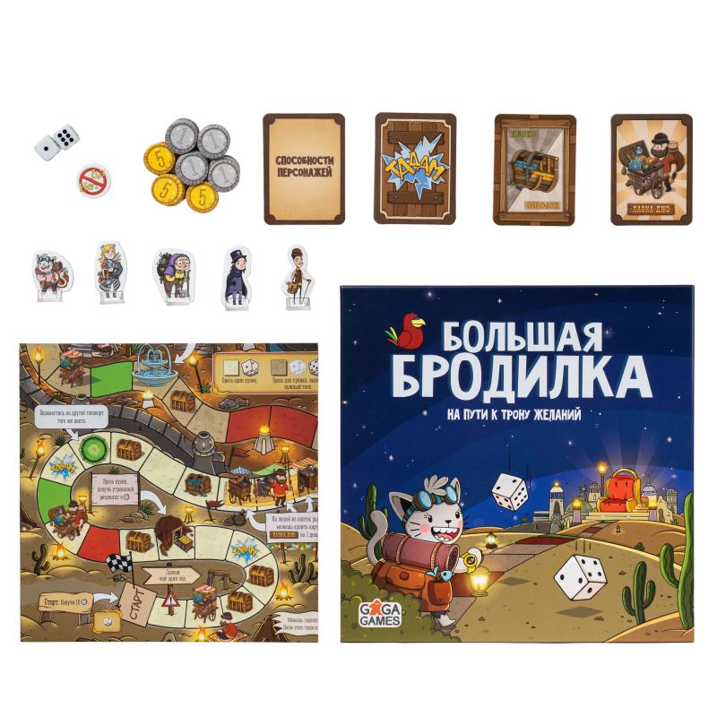 Легендарное путешествие по стране, где все хотят всё, продолжается! Большая Бродилка: На Пути к Трону Желаний – это ещё одна самостоятельная игра в одноимённой серии азартных семейных стратегий. Вам всё так же предстоит выбрать себе одного из искателей приключений и принять участие в динамичной гонке к финишу, но теперь – на совершенно новом поле и с совершенно новыми героями! Теперь, бросая кубики и двигаясь по полю, вы сможете отыскать фонтан желаний, заключить сделку с волшебным свитком, попытаться с разбегу перепрыгнуть захлопнувшиеся перед самым носом ворота, исследовать таинственную заброшенную шахту и многое другое! По пути вам всё так же встретятся порталы, в которые можно и нужно прыгать, сундучки “Хорошо” и “Плохо”, дающие вам приятные или не очень бонусы, клетки с Лавкой Джо, в которой можно будет приобрести суперсилы, а также на вас снова будут действовать вездесущие “Та-дамы”, лихо меняющие правила игры и делающие каждую партию уникальной и не похожей на предыдущие. Каждый из пяти новых персонажей будет иметь свои уникальные способности, разумное применение которых может стать вашим ключом к победе. Ну что, готовы бросить кубики и отправиться в путь к Трону Желаний? :)