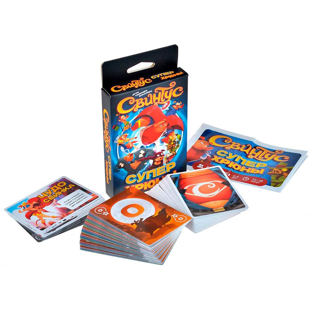 Настольная игра Свинтус Суперхрюны Hobby World 915775. Свинтус Суперхрюны – новая часть популярной серии быстрых и весёлых карточных игр. Тематика супергероев хорошо подходит, чтобы заинтересовать детей настольными играми, но и взрослым тоже будет интересно попробовать новую часть “Свинтуса”! Ведь помимо изменённых иллюстраций в игре вас ждут новые уникальные способности, 8 забавных Суперхрюнов и новый режим игры – секретная миссия!