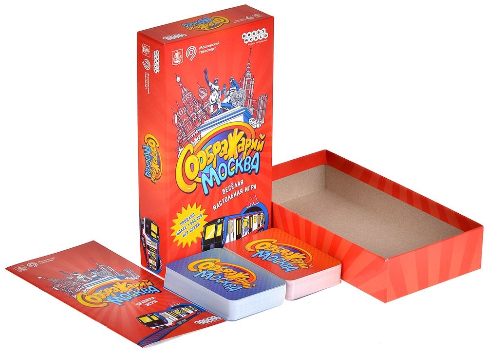 “Соображарий: Москва” – новая версия знаменитой настольной игры для вечеринок и уютных семейных посиделок. На этот раз вам предстоит вспоминать всевозможные слова, связанные со столицей России – Москвой. Каждый ход вы будете тянуть из колоды карты букв и категорий, а потом проявлять чудеса смекалки и находчивости, пытаясь первым назвать подходящее слово.