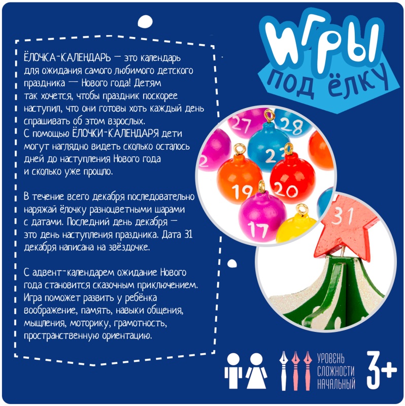 Всем детям нравится подготовка к Новому году. Набор для творчества деревянная ЕЛОЧКА КАЛЕНДАРЬ 3D сделает ожидание праздника в течение всего декабря веселым и интересным. Увлекательная игра не только создаст новогоднюю атмосферу, но и поможет развить мелкую моторику, фантазию и эмоциональный интеллект ребенка. Работать с деревянным конструктором очень просто. Соедините две части каркаса и установите елочку на подставку. Поставьте сборную модель на видное место и каждый день вешайте на елочку одну миниатюрную игрушку с датой. А в канун праздника нарядите верхушку новогоднего дерева звездой с числом 31. ЕЛОЧКА КАЛЕНДАРЬ 3D от Бондибон выполнена из качественных экологичных материалов. После праздников Вы сможете легко снять шарики и разобрать елочку, чтобы использовать набор в следующем году. В набор входят: 2 части каркаса для елочки, подставка, 31 шарик с датой. Высота дерева 29см Возраст 3+