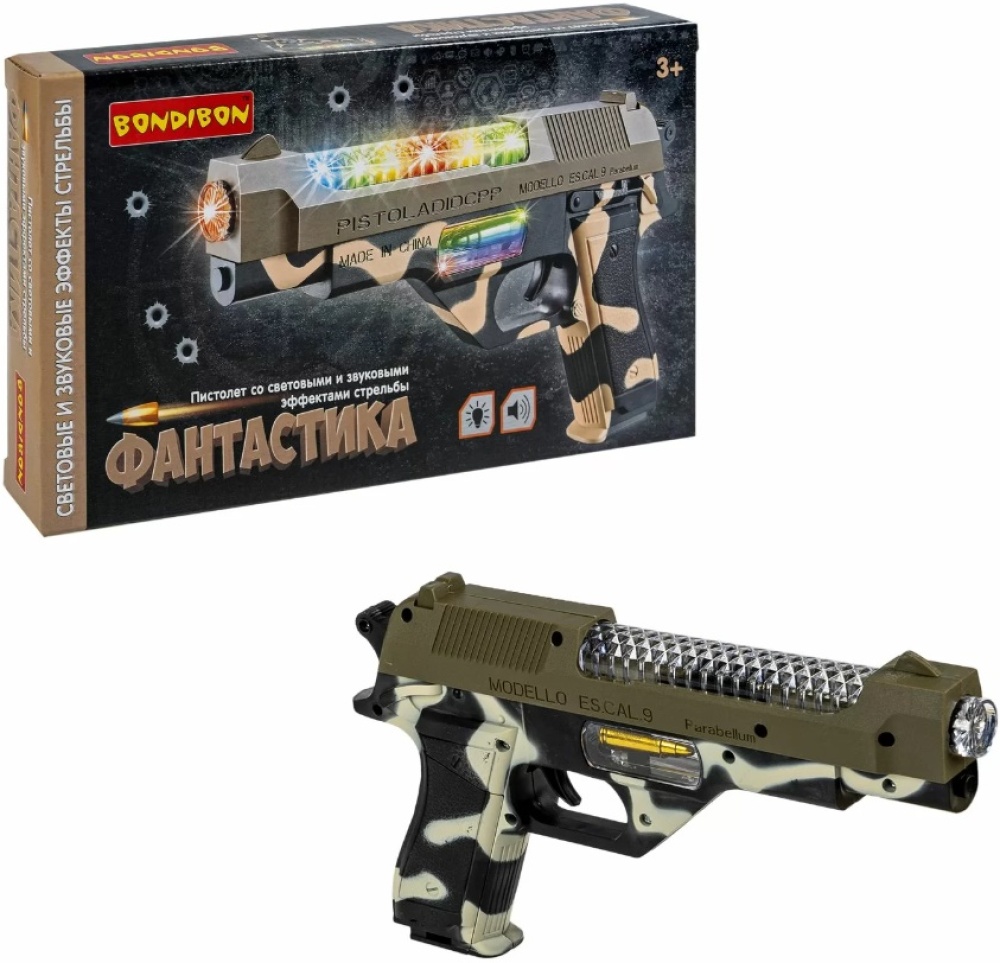 Это просто ФАНТАСТИКА! Игрушечное оружие пистолет в расцветке камуфляж от Bondibon с многоцветной подсветкой и звуковыми спецэффектами. Яркий сверкающий бластер – отличный подарок для мальчиков, ведь он дает возможность почувствовать себя сильным, храбрым и смелым. К тому же, ролевые игры с применением детского оружия помогают развить воображение и сообразительность малыша. Активные игры в войнушку позволяют детям выпустить пар, а также закладывают характерные для будущих мужчин нормы и модели поведения. Например, стремление быть защитником и воином. Начать играть просто. Вставьте батарейки, нажмите на курок. Игрушка размером 28 х 18 см, в расцветке черно-коричневый камуфляж, с эффектной разноцветной подсветкой. Дополнительно понадобятся 3 батарейки АА (не входят в набор). Возраст 3+ Выберите сверкающий автомат ФАНТАСТИКА от Бондибон в подарок ребенку и удивите его в День рождения, на Новый год или любой другой праздник. Подарите незабываемые эмоции!
