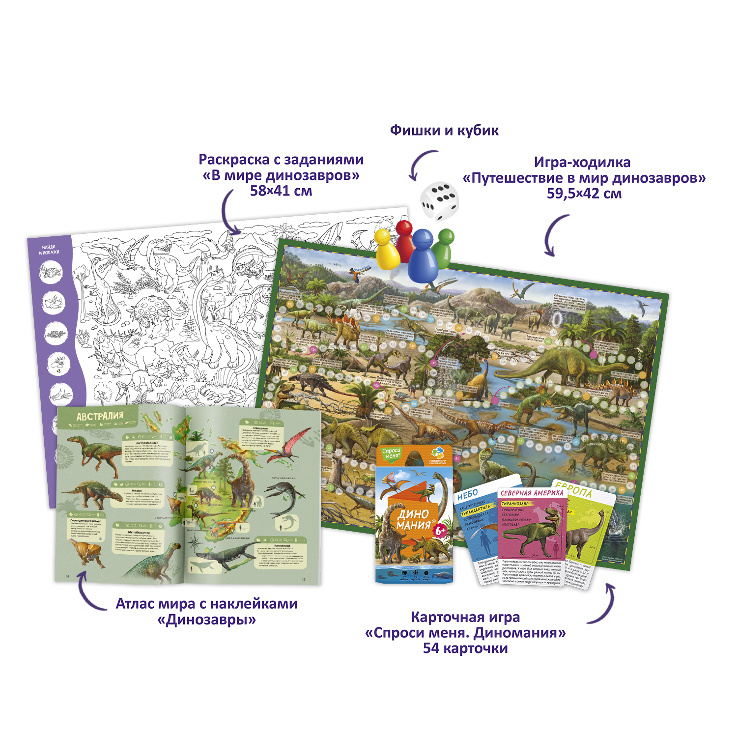 2. Игра-ходилка “Путешествие в мир динозавров, формат поля 59*42 см, 4 фишки+кубик.