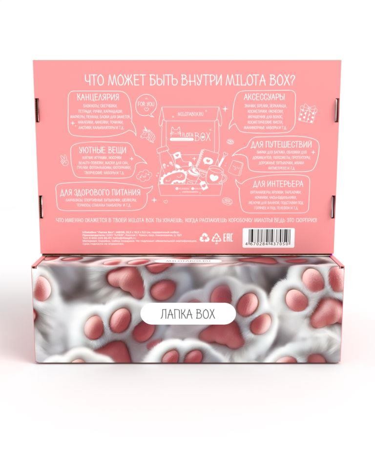 Каждая коробочка милоты наполнена необычными вещицами, которыми будет приятно пользоваться в повседневной жизни: милая канцелярия, уютные товары для дома, стильные аксессуары, предметы для здорового образа жизни и приятные мелочи. Наполнение MilotaBox стало ещё лучше! Больше подарков! Внутри каждого MilotaBox находится до 13 предметов на одну тематику, упакованных в стилизованную бумагу тишью. Коробочка из плотного, дизайнерского картона. Размер коробочки: 28,5 х 18,5 х 9,5 см.