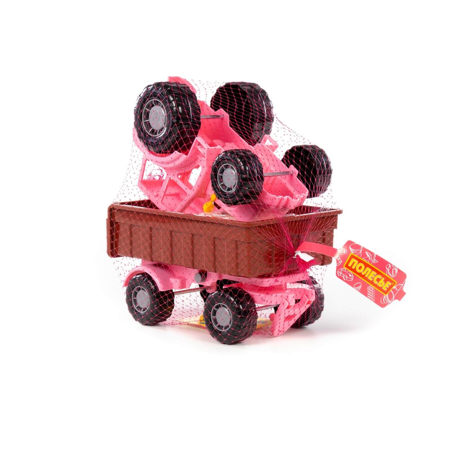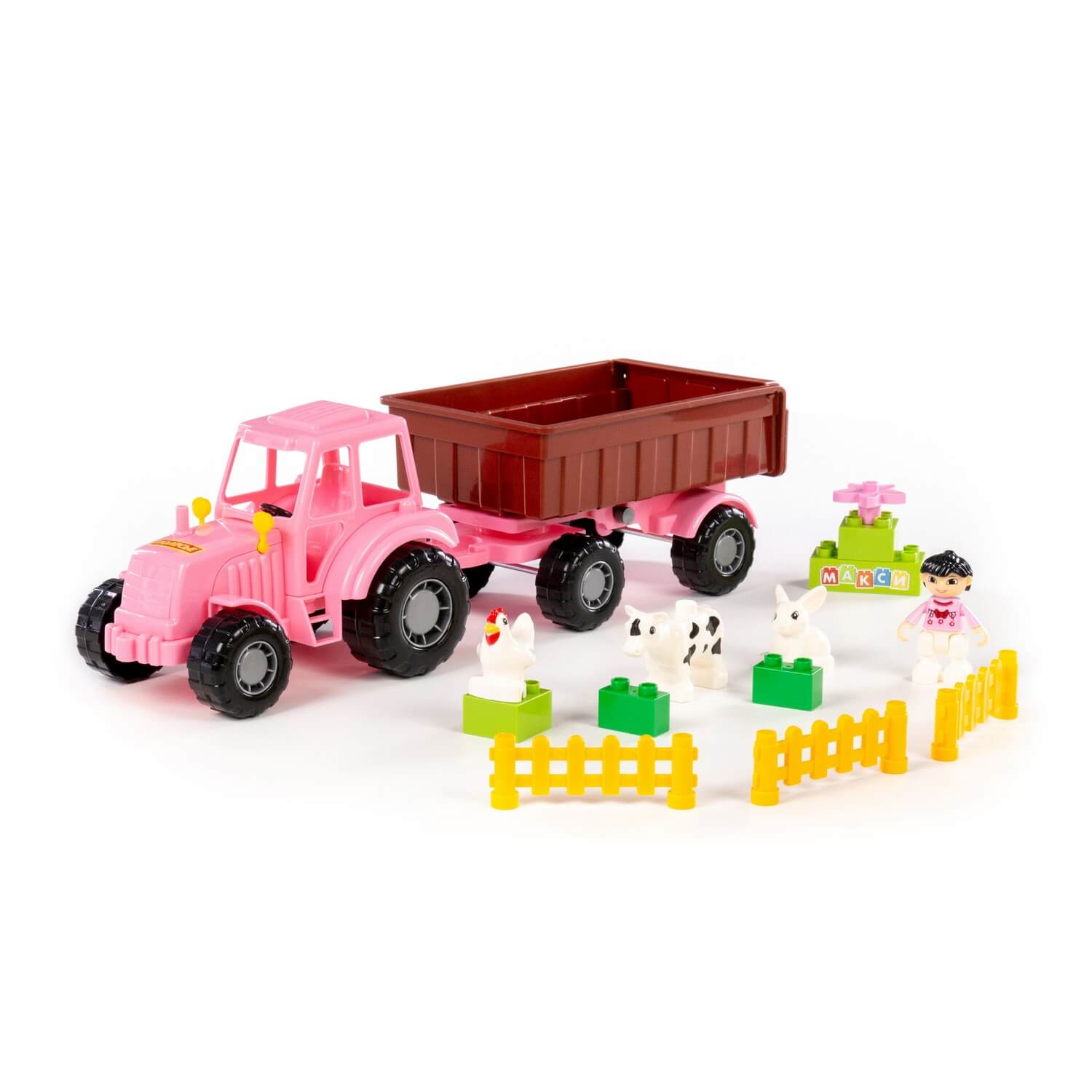 С игровым набором от компании «Полесье» ребёнок сможет погрузиться в яркий и увлекательный мир фермеров и домашних животных! Набор включает в себя розовый трактор с прицепом «Мастер» и конструктор серии «Макси» с фигурками животных (курочка, коровка, кролик), заборчиками, цветами и фигуркой девочки.