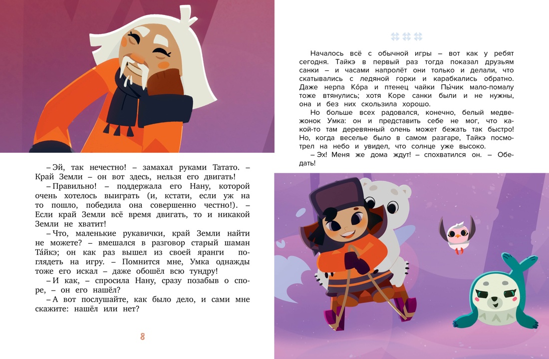 Вместе со своими друзьями полярной волчицей Ильмой, розовой чайкой Пычиком, нерпой Корой и мальчиком Тайкэ он исследует загадочную природу