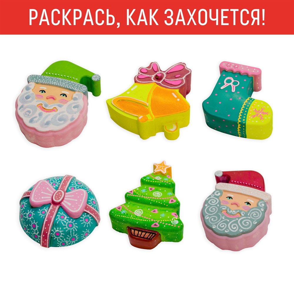 Подарите себе настоящее ощущение праздника с набором для творчества из шести новогодних гипсовых фигурок! Внутри вы найдёте шесть фигурок из гипса: фигурку Деда Мороза, Санты Клауса, ёлочку, подарок, сапожок и колокольчики — всё, что ассоциируется с волшебством и уютом зимних праздников. Каждая фигурка упакована в защитную плёнку, чтобы сохранить форму и детали при транспортировке. Для раскрашивания лучше всего подойдут гуашь или акриловые краски — они создадут яркое и плотное покрытие. Придумайте собственное оформление или следуйте инструкции на обороте упаковки — результат в любом случае будет радовать глаз!