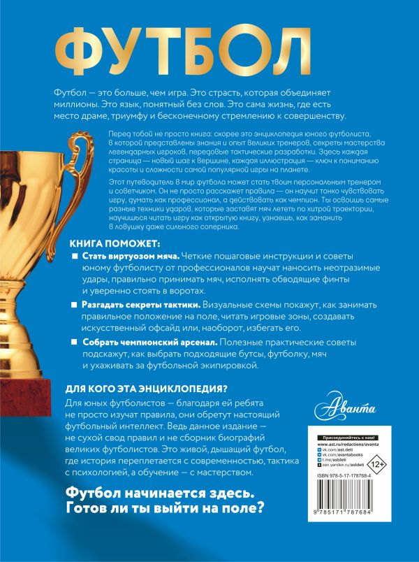 Перед вами книга, целиком посвященная футболу — великой спортивной игре, не оставляющей равнодушными ни детей, ни взрослых. Ее первейшая задача — объяснить во всех подробностях и донести до каждого юного читателя философию и дух самой популярной игры на планете. Это издание вобрало в себя все, чего современный футбол достиг за свою историю — от его истоков в глубокой древности, появления в России и до наших дней. Теоретическая часть книги охватывает главные аспекты непосредственно самой игры: основные правила и особые нюансы, многие из которых известны лишь профессионалам, базовые тактические схемы, виды ударов, способы их нанесения и многое-многое другое. И что важно: эти правила объясняются на конкретных событиях из истории, например: почему “золотой гол” канул в Лету, как работало правило выездного гола и почему вбрасывание из аута может быть опаснее углового. Технические разделы — кладезь практических советов начинающим футболистам: они узнают, как наносить крученый и другие виды ударов, принимать мяч грудью, исполнять “финт Кройфа” или “марсельскую рулетку”, выбирать позицию на поле, чеканить мяч, читать сигналы арбитра. Книга наполнена практическими советами и подсказками юному игроку, объясняет сложные футбольные термины. Кроме того, здесь представлена галерея легендарных игроков и тренеров, навсегда оставивших свой след в истории футбола, рассказывается о становлении и пути на вершины пьедесталов величайших футбольных клубов. Не остались без внимания крупнейшие мировые турниры, собирающие миллионы зрителей на футбольных аренах. И все это сопровождается уникальными фотографиями, запечатлевшими лучшие моменты этой фантастической игры. Данная книга не просто дает мальчишкам знания о конкретном виде спорта — она вдохновляет выйти на поле, ведь футбол был и остается красивейшей игрой, которая увлекает и ведет за собой огромное количество последователей и преданных болельщиков.