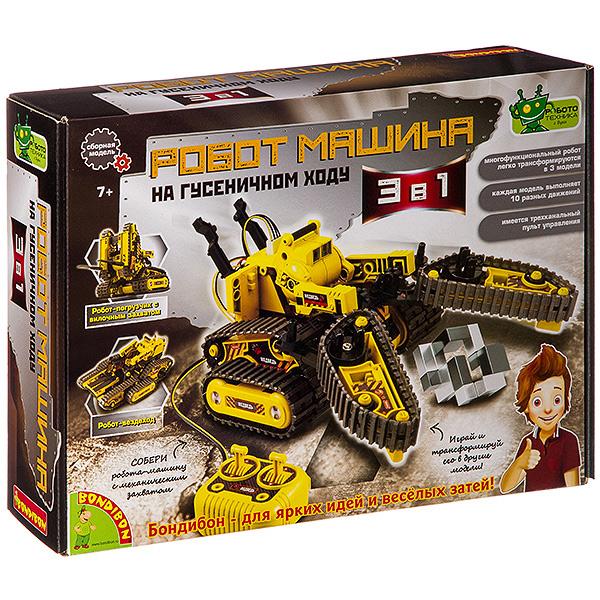 РОБОТ МАШИНА 3 в 1– это многофункциональный робот на гусеничном ходу. Он управляется проводным пультом, что позволяет ему двигаться вперед и назад и поворачивать влево или вправо. Можно также посмотреть, как вездеход ездит по разной местности, как погрузчик с вилочным захватом поднимает платформу или как робот с механическим захватом берет предметы.