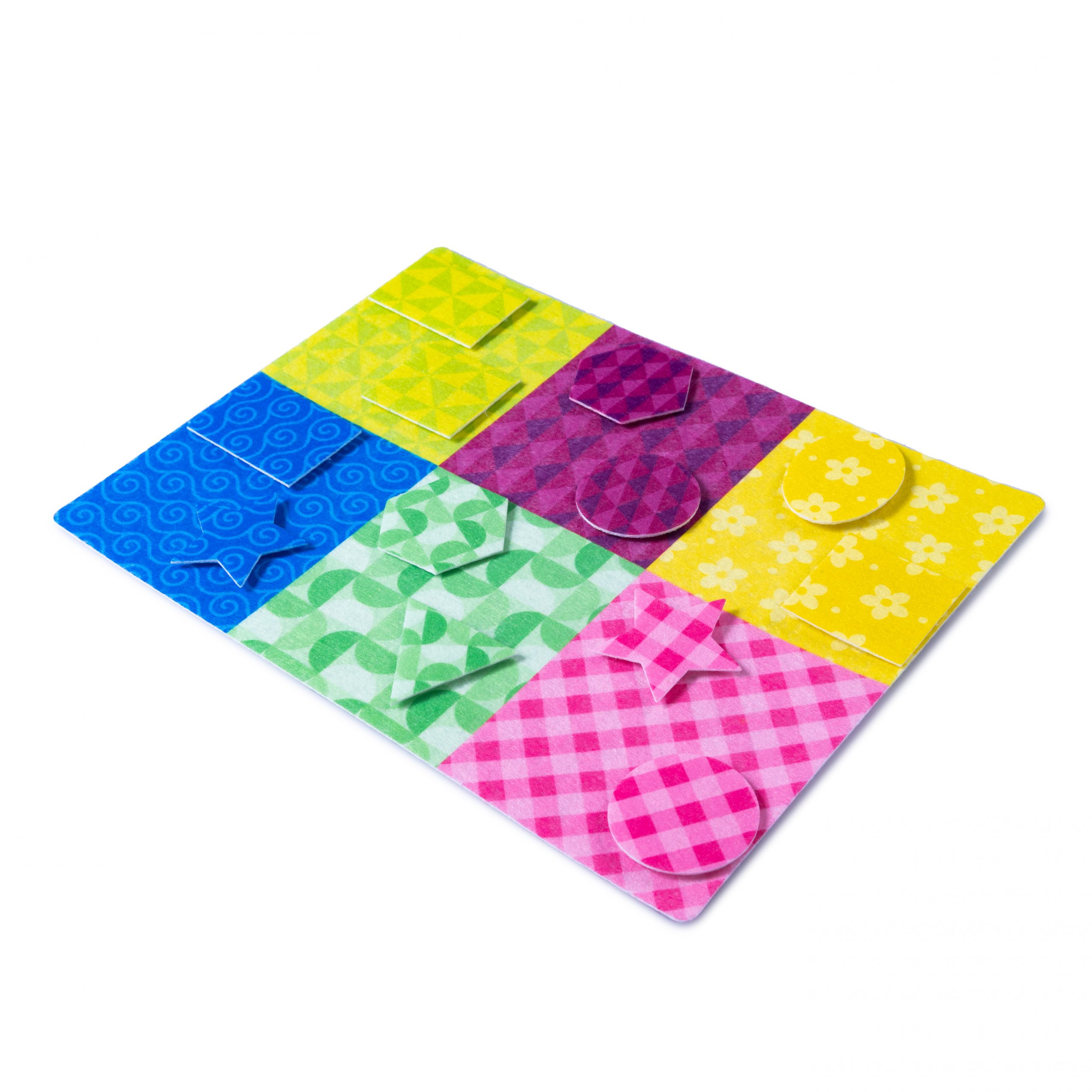 Геометрические фигуры крепятся к игровому полю с помощью липучек «велькро». Их легко соединять и разъединять, при этом детали крепко держатся на игровом поле, когда липучки соединены.