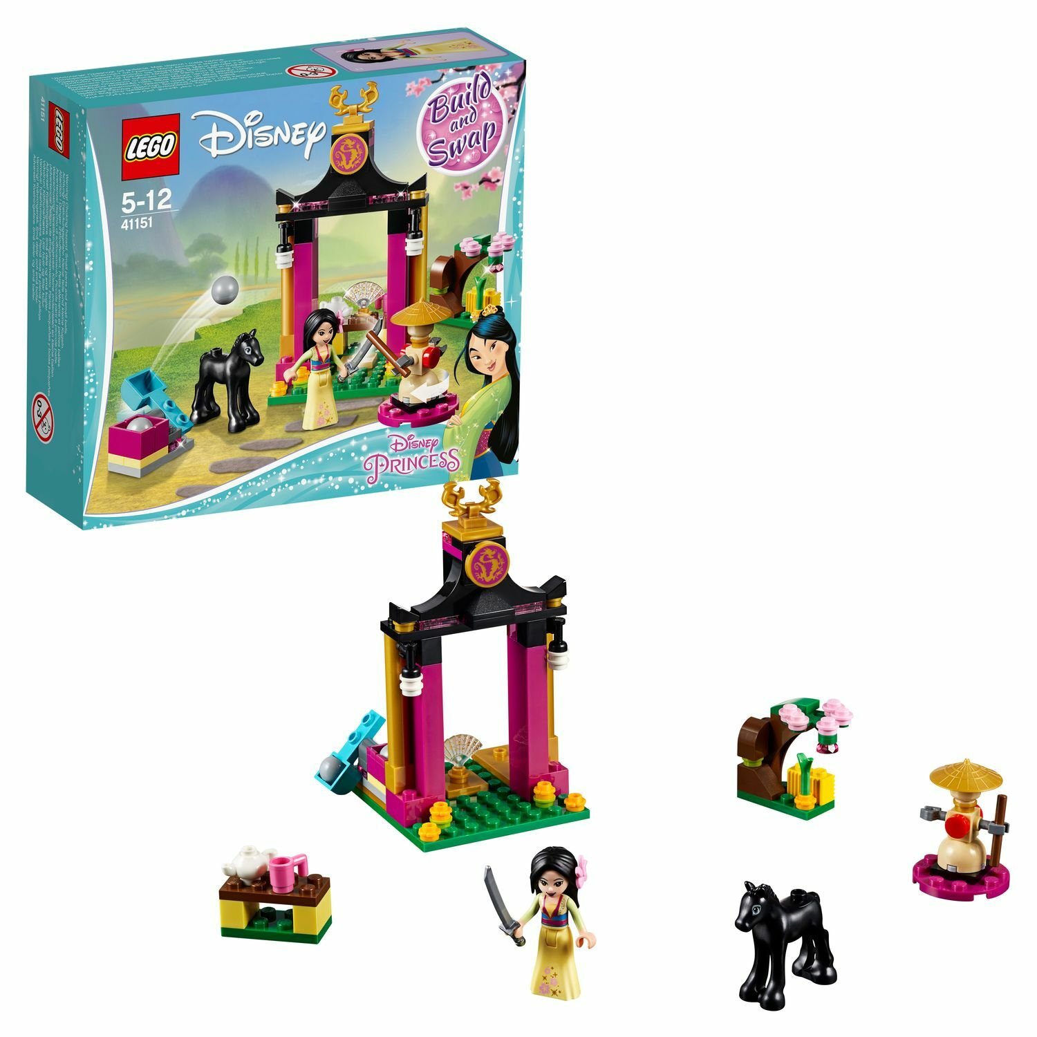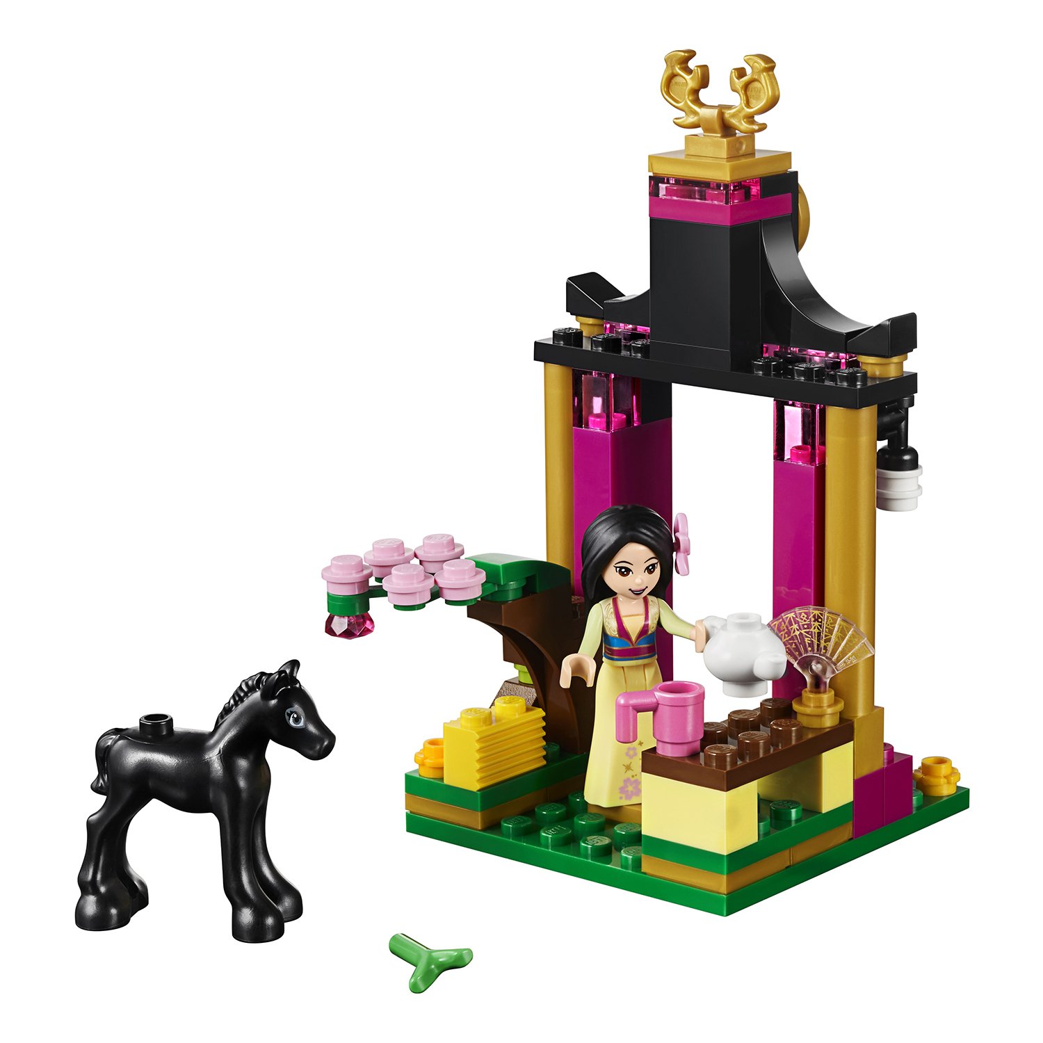 В набор также входит чёрно-розовая арка с золотыми отливами и эмблемой дракона, цветущая вишня, чайник, кружка и полочка. Сама Мулан выглядит женственно: на ней надета длинная жёлтая юбка с цветочками, трёхцветная кофта с длинным рукавом, а в волосы вставлен нежно-розовый цветок. В наборе вы также найдёте фигурку любимого коня девушки – храброго Хана.