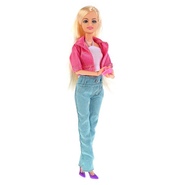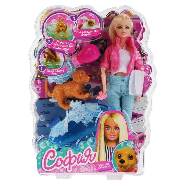 На Софии модная одежда: голубые джинсы, белый топ, розовая куртка и туфли (легко снять и одеть). Лицо куклы детально проработано. Руки и ноги куколки сгибаются (на шарнирах). Шелковистые длинные волосы Софии легко расчёсывать и создавать разнообразные причёски. Куклу и питомца можно купать.