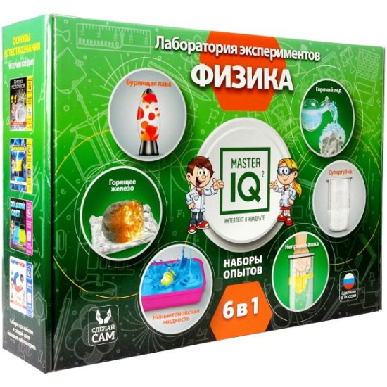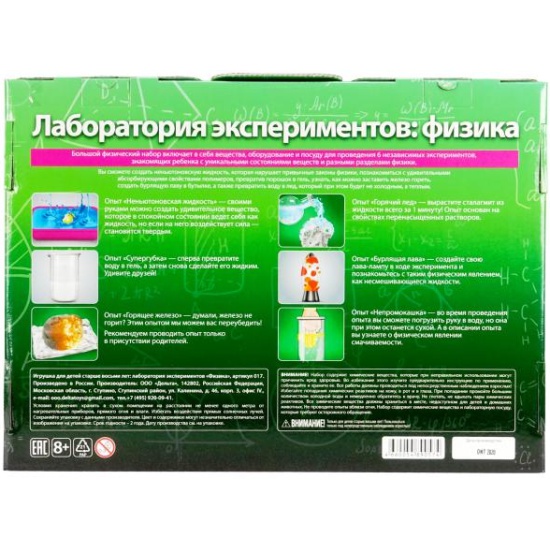 Набор включает в себя вещества, оборудование и посуду для проведения 6 независимых экспериментов, знакомящих ребенка с уникальными состояниями веществ и разными разделами физики.