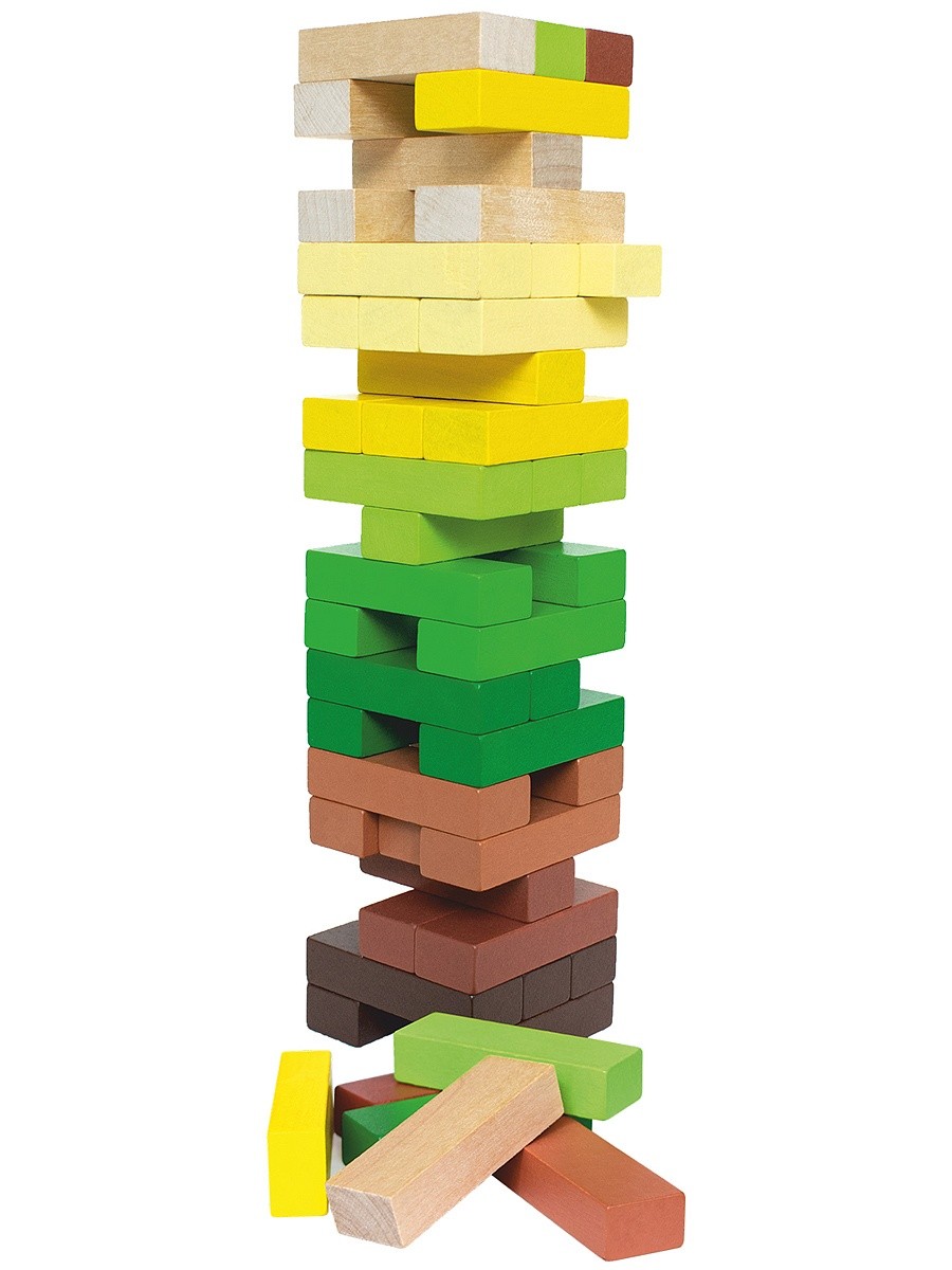 В начале игры сложите башню из 18 уровней по три бруска в каждом, так, чтобы бруски соседних уровней лежали в разных направлениях. После того как башня готова, по очереди вытаскивайте из нее по одному брусочку и перемещайте его на самый верхний уровень, тем самым, продолжая строительство башни и постепенно уменьшая ее устойчивость.