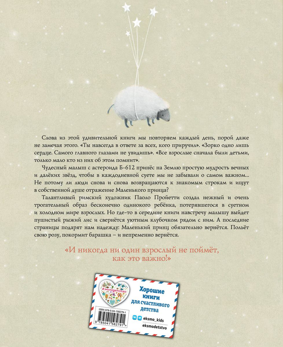В иллюстрациях Паоло Пройетти к «Маленькому принцу» золотисто-пепельные тона сменяются серебристо-синими, и, листая эту книгу, мы словно проживаем вместе с главным героем день за днём. А нежно-алая роза на последних страницах помогает поверить, что чудесный малыш когда-нибудь обязательно вернётся.