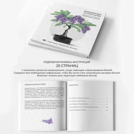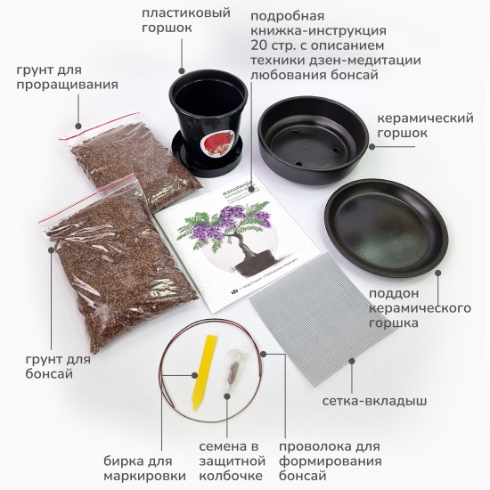 Набор позволяет прикоснуться к древнему искусству бонсай и насладиться красотой и умиротворением, которые оно способно подарить. Неподдельное восхищение охватывает душу при виде пышно цветущей иноземки жакаранды. Пушистый лист её будто вдохновлён древним тропическим папоротником, а толстые гроздья нежно-сиреневых цветов напоминают чарующий букет фиалок или гроздь поспевающего винограда. В бонсае жакаранда имеет до того прекрасный вид, что невольно хочется сказать – вот она, Королева бонсая.