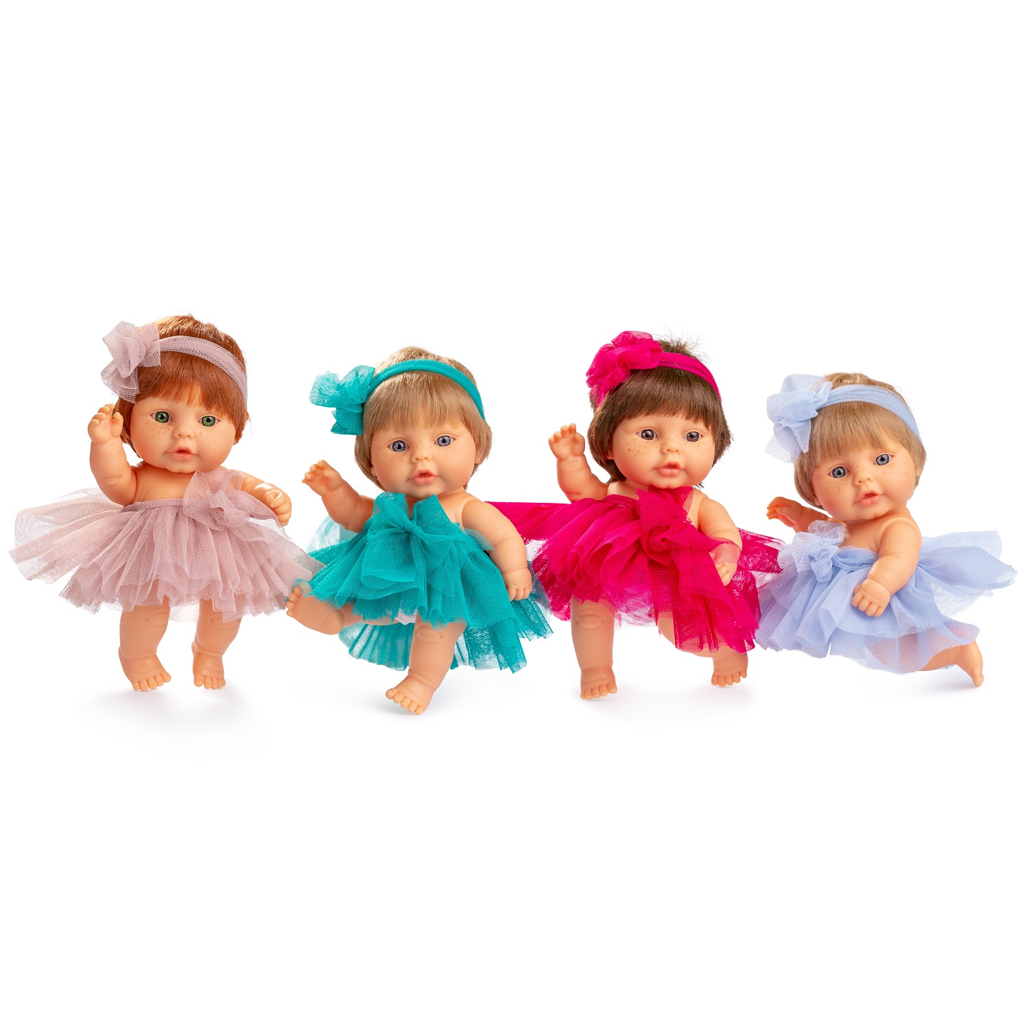 Очаровательные пупсята от Berjuan в своих фатиновых юбочках похожи на цветочки. Малыши ростом 18 см, с прошитыми волосиками и акриловыми глазками. Полностью винил без ароматизаторов. Будут отличным подарком для ребенка, а также могут украсить ваш дом. Компактных пупсят удобно брать с собой на прогулку и в путешествие!